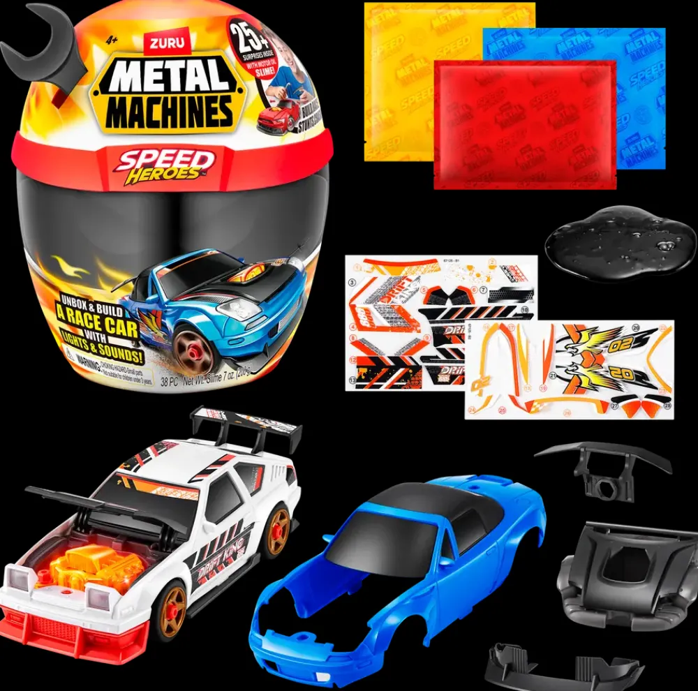 Oplev fart, sjov og kreativ leg med Zuru Metal Machines Speed Heroes! Denne spændende racerhjelm gemmer på over 25 overraskelser, som børnene kan udforske, når hjelmen åbnes. Indeni finder du dele til at bygge din helt egen racerbil – fra karrosseri og motordele til klistermærker og dekorationer, så bilen får sit helt personlige udtryk.Med to forskellige bilstel i hver hjelm kan du kombinere og tilpasse udseendet på flere måder. Når bilen er samlet, vækkes den til live med lys og realistiske motorlyde, som gør legen endnu mere virkelighedstro. De mange dele giver mulighed for at bygge, skille ad og samle igen, så legen kan fortsætte i timevis.Hver Speed Hero leveres med to unikke bilstel, og der findes i alt seks modeller at samle i serien. Raceren bruger 3 stk. LR44-batterier (inkl.), så den er klar til at køre direkte ud af pakken. Et sjovt og engagerende byggesæt, der kombinerer kreativitet, konstruktion og actionfyldt leg for børn fra 4 år.Specifikationer:Farve: Flere farverMateriale: 83,95% PP, 13,22% ABS, 1,57% Clear PP, 0,51% Fe₃O₄, 0,48% jern, 0,1% glasfiber, 0,1% silikone, 0,04% kobber, 0,02% PE, 0,01% TPUIndhold: 20+ overraskelser, 2 bilstel, klistermærker, dele til racerbil, slimeBatterier: 3 stk. LR44 (inkl.)Egenskaber: Lys- og lydeffekter, udskiftelige dele, flere kombinationsmulighederAnbefalet alder: Fra 4 årModel kan ikke vælges ved køb i webshoppen.