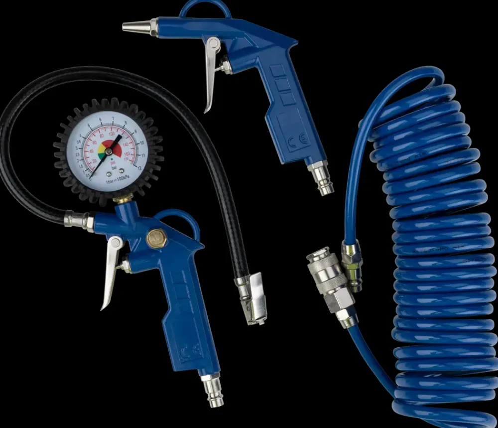 Kompressorsæt med tre dele: blæsepistol til rengøring, pumpepistol med manometer til oppumpning samt 5 m spiralslange i fleksibelt PU-materiale.Sættet har lynkobling og universal Euro-nipler, som passer til de fleste standardkompressorer. Driftstryk: 2–6 bar. Maks. arbejdstryk: 8 bar.Velegnet til oppustning og rengøring i hjemmet eller værkstedet. Pumpepistolen har integreret manometer, og slangen er nem at koble til og fra.