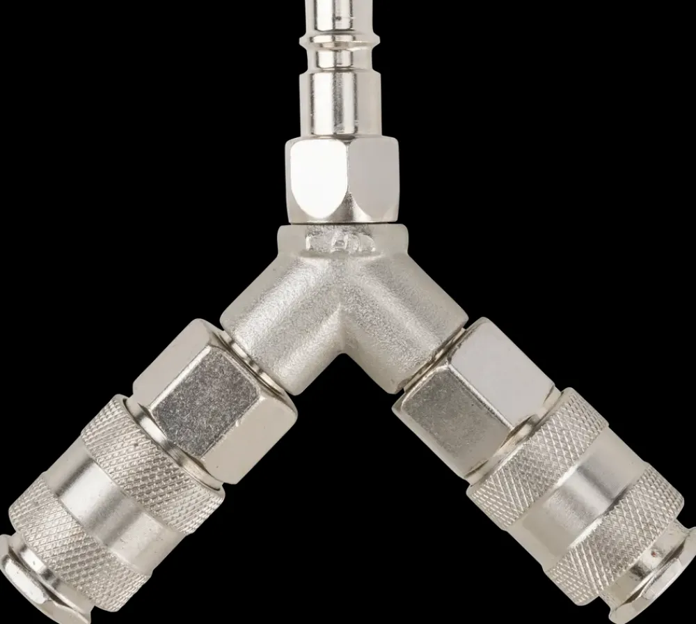 Forgrener med 2 koblinger, lige til at sætte i kompressorens kobling, på den måde slipper man for at skifte slange fra det ene trykluftværktøj til det andet.