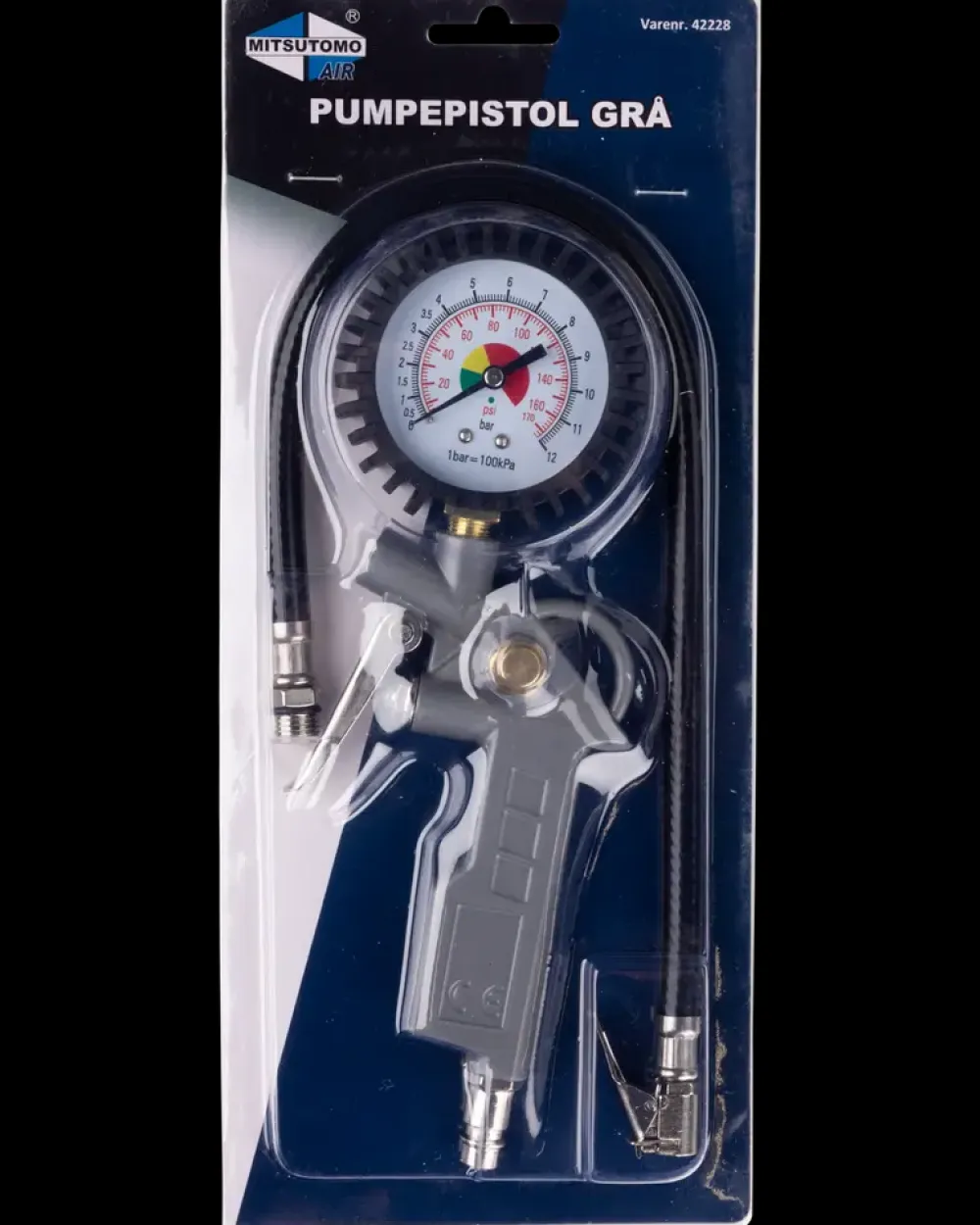 Pumpepistol til oppumpning af dæk på bil, knallert og cykel. Udstyret med manometer, reguleringsventil og 40 cm PVC-slange.Tilsluttes med lynkobling til standard trykluftsystem. Passer til almindelige ventiltyper.Manometeret viser dæktrykket nøjagtigt, og udluftningsknappen gør det muligt at finjustere trykket. Pistolen har robust greb og låsefunktion til ventilen.Maks. arbejdstryk: 8 bar. Kompakt design – nem at opbevare i bil eller værksted.