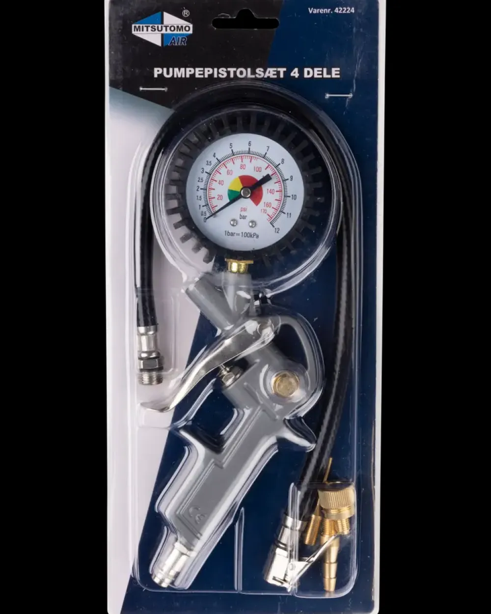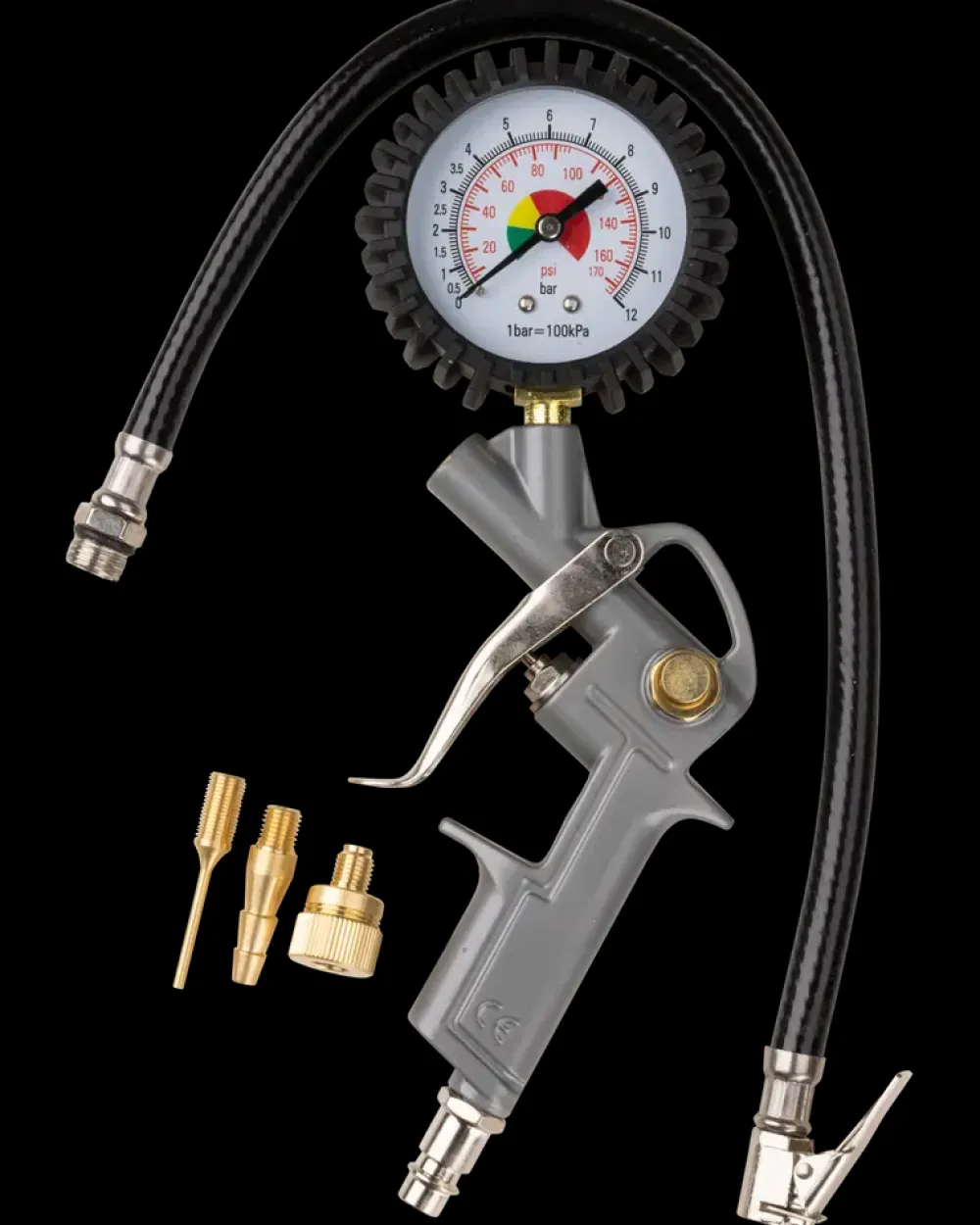 Luftoppustningspistol med kontrolventil og trykmåler.Ideel til pumpning af cykler, knallerter og biler.40 cm PVC-slangeMaks tryk: 8 BAR