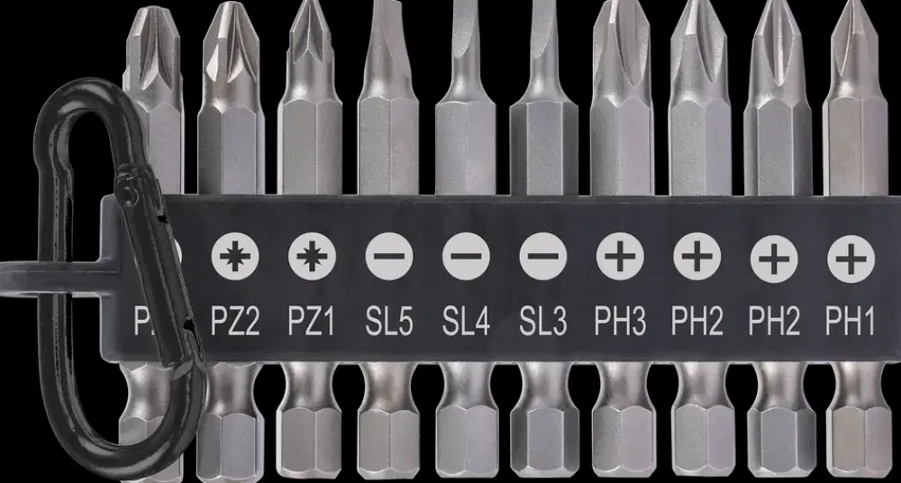 PH, PZ og lige kærv bitssæt med 10 dele fra Mitsutomo.Bits fremstillet af stærk S2 stål.Leveres i en praktisk holder, der gør det nemt at organizere og opbevare dem.Sættet består af:3 stk. SL: 3, 4, 5 mm4 stk. PH: 1, 2, 2, 33 stk. PZ: 1, 2, 3
