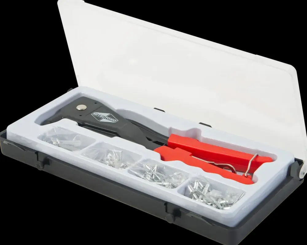 Kraftig nittetang fra Mitsutomo med plastovertrukne greb samt 4 mundstykker i ass. størrelser og 4 pakker nitter. I alt 100 stk. med krave af aluminium.Leveres samlet i praktisk opbevaringskasse.Sættet indeholder nitter 4 forskellige str.:25 stk. i str.: 2,4 mm.25 stk. i str.: 3,2 mm.25 stk. i str.: 4,0 mm.25 stk. i str.: 4,8 mm.