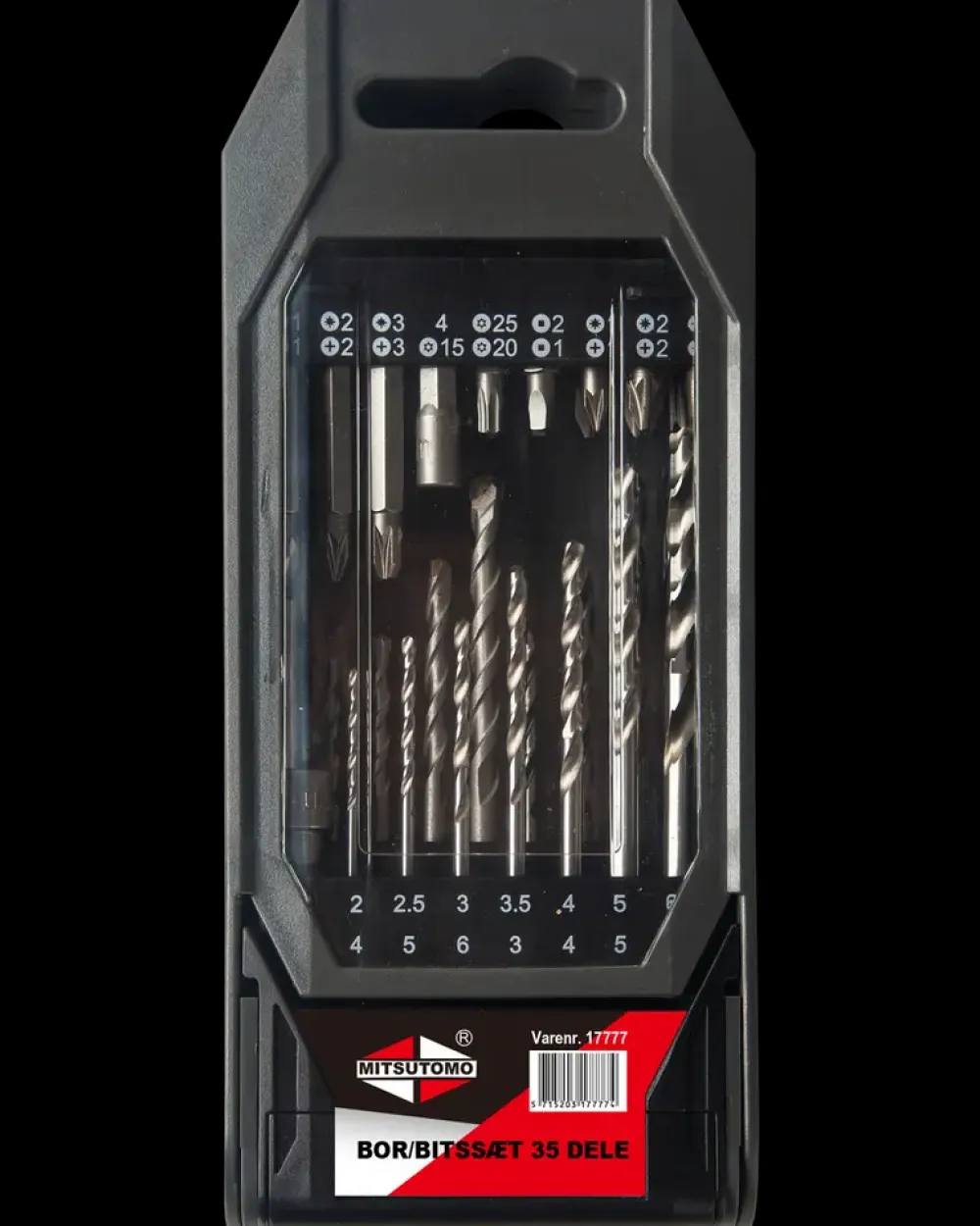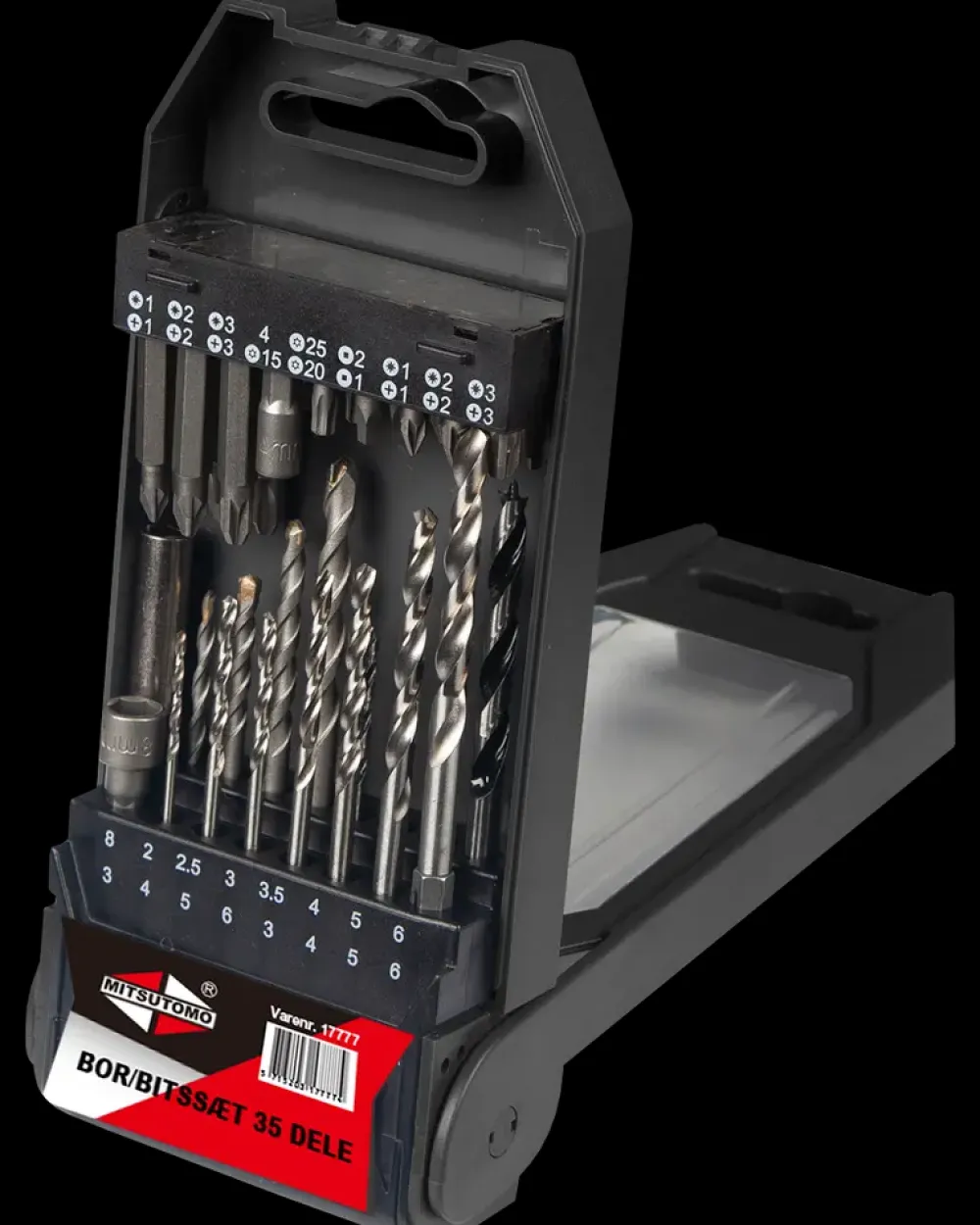 Dette praktiske bor- og bitssæt med 35 dele fra Mitsutomo kan bruges til mange forskellige bore- og skrueopgaver. Sættet leveres i en opbevaringsæske.Sættet indeholder: 4 stk. murbor:3 x 4 x 5 x 6 mm.7 stk. HSS metalbor:2 x 2,5 x 3 x 3,5 x 4 x 5 x 6 mm.4 stk. træbor:3 x 4 x 5 x 6 mm.11 stk. 25 mm bits:PH1 x PH2 x PH3.PZ1 x PZ2 x PZ3.TT15 x TT20 x TT25.SQ1 x SQ2.6 stk. 50 mm bits:PH1 x PH2 x PH3.PZ1 x PZ2 x PZ3.2 stk. Hex bits:4 x 8 mm.1 stk. magnetisk bitsholder.