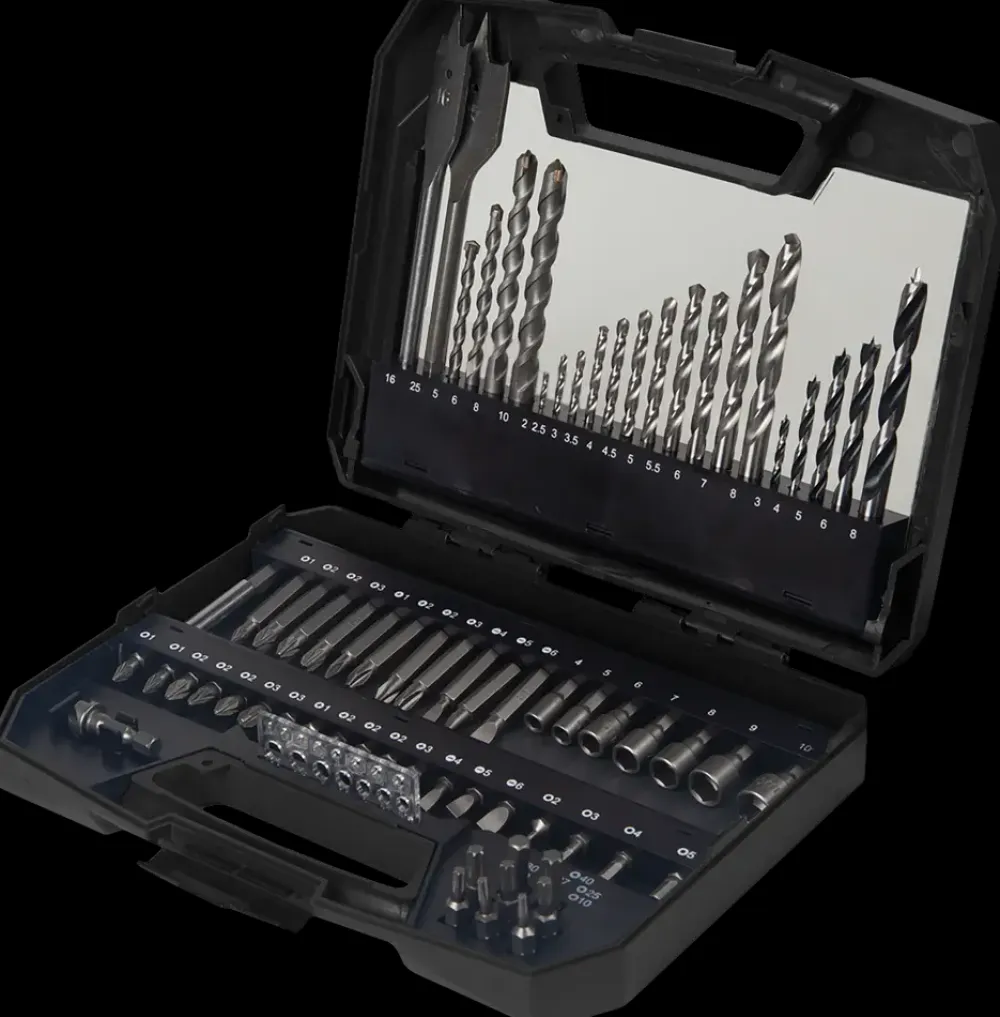 Dette praktiske bor- og bitssæt med 70 dele fra Mitsutomo kan bruges til mange forskellige bore- og skrueopgaver. Sættet leveres i en kuffert.Sættet indeholder: 4 stk. murbor:5 x 6 x 8 x 10 mm.11 stk. HSS metalbor:2 x 2,5 x 3 x 3,5 x 4 x 4,5 x 5 x 5,5 x 6 x 7 x 8 mm.5 stk. træbor:3 x 4 x 5 x 6 x 8 mm.2 stk. fladbor:16 x 25 mm.27 stk. 25 mm bits:1 stk. PH1 x 3 stk. PH2 x 1 stk. PH3.2 stk. PZ1 x 3 stk. PZ2 x 2 stk. PZ3.SL4 x SL5 x SL6.H2 x H3 x H4 x H5 x H6.T10 x T15 x T20 x T25 x T27 x T30 x T40.11 stk. 50 mm bits:1 stk. PH1 x 2 stk. PH2 x 1 stk. PH3.1 stk. PZ1 x 2 stk. PZ2 x 1 stk. PZ3.SL4 x SL5 x SL6.1 stk. magnetisk bitsholder.7 stk. toppe:4 x 5 x 6 x 7 x 8 x 9 x 10 mm.1 stk. bor/hul-måler i plast.1 stk. forsænkningsbor, 12,5 x 36 mm.