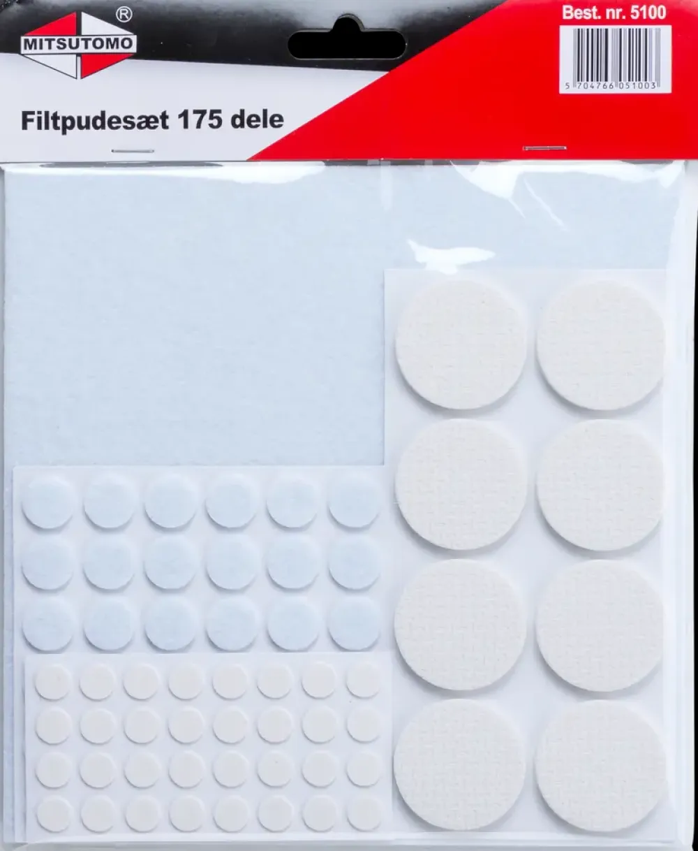Filtpudesæt fra Mitsutomo i forskellige størrelser og former til at sætte under møbler, skåle, vaser m.m. for at beskytte underlaget.