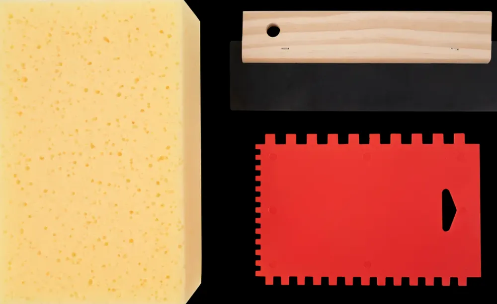 3-delt værktøjssæt til flisearbejdeVelegnet til rengøring, fugning og påføring af fliseklæb.Sættet indeholder:– Murersvamp (200 x 120 x 60 mm) til aftørring og rengøring af fliser– Gummispartel med træhåndtag (180 x 40 x 20 mm)– Tandspartel med tænder: 8 x 8 mm, 6 x 6 mm og 4 x 4 mmAlle dele er fremstillet i slidstærkt PP-materiale og stål for lang levetid.