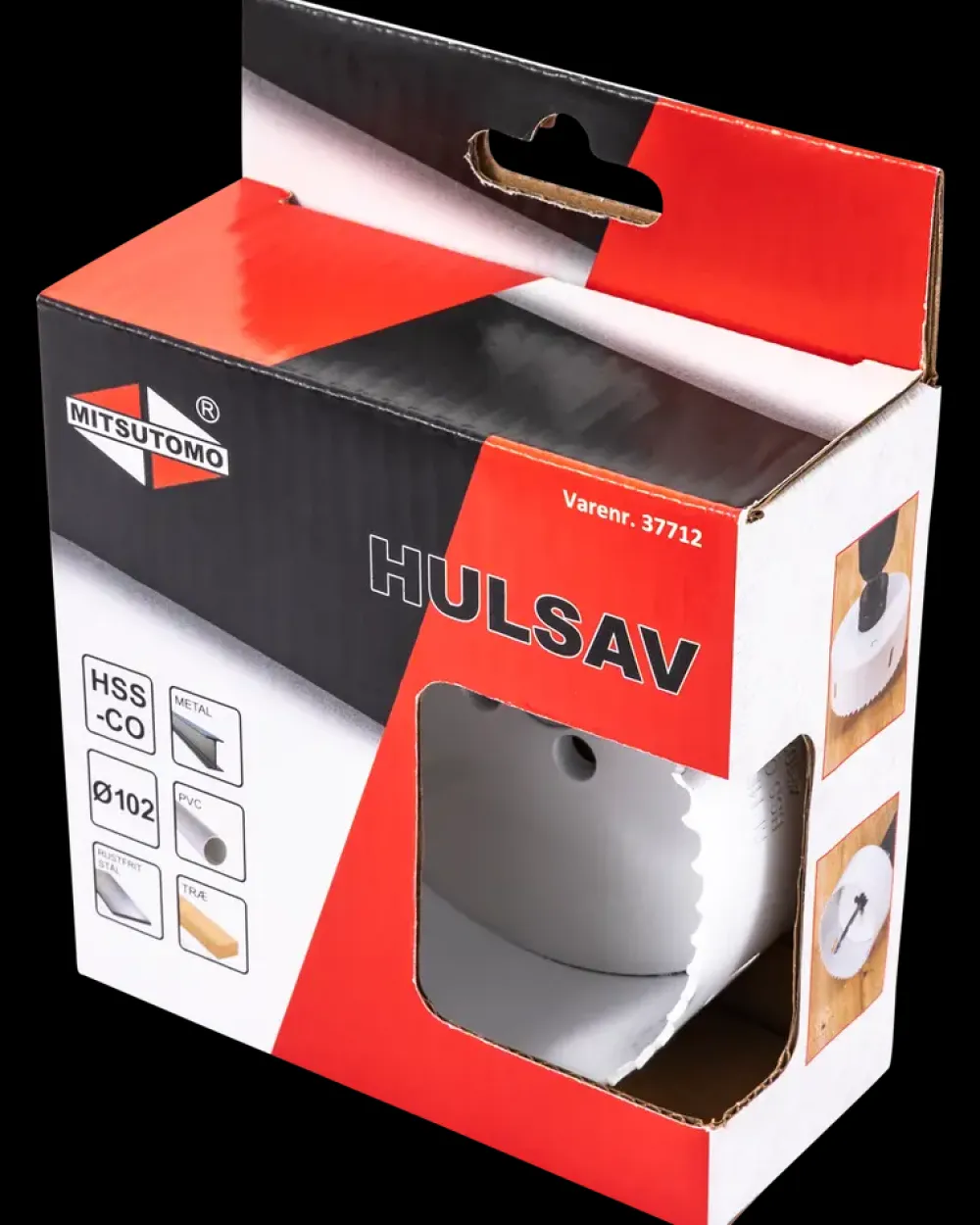 Hulsav fra Mitsutomo. Professionel håndværkerhulsav lavet af HSS Bi-metal M42 stål med 8% kobolt.Hulsaven sættes på en hulsavsholder og bruges med en batteri boremaskine, stationær bormaskine eller drejebænk.Den kan skærer i gipsplader, træ, lamineret træ, spånplader, kunststofplader, PVC, metaller, og er særdeles god til rustfrit stål.Skæredybde: 38 mm