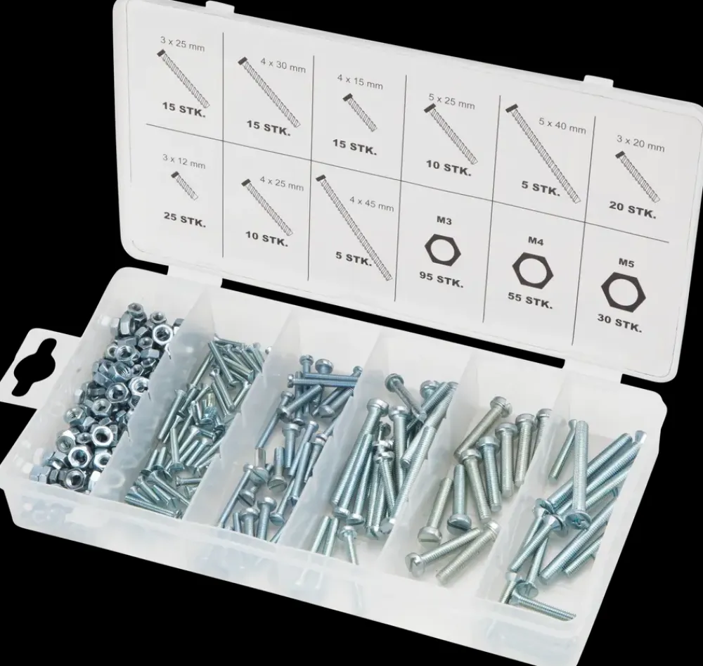 El-forzinkede maskinskruer fra Mitsutomo, komplette med møtrikker. Sættet består af:15 stk. med cylinderhoved: Ø3 x L. 25 mm.15 stk. med cylinderhoved: Ø3 x L. 30 mm.15 stk. med cylinderhoved: Ø3 x L. 15 mm.10 stk. med cylinderhoved: Ø3 x L. 25 mm.5 stk. med cylinderhoved: Ø3 x L. 40 mm.20 stk. med undersænket hoved: Ø3 x L. 20 mm.25 stk. med undersænket hoved: Ø3 x L. 12 mm.10 stk. med undersænket hoved: Ø4 x L. 25 mm.5 stk. med undersænket hoved: Ø4 x L. 45 mm.95 stk. møtrikker: M3.55 stk. møtrikker: M4.30 stk. møtrikker: M5.