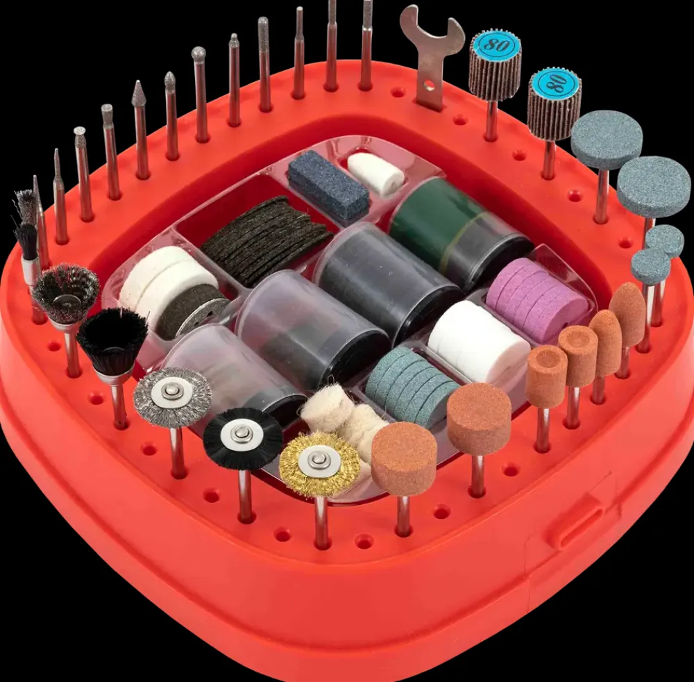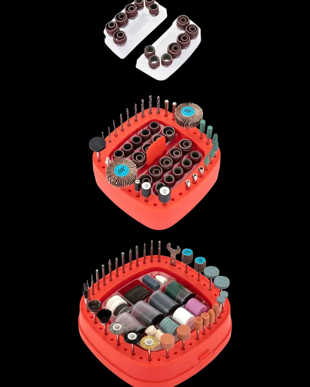 Multiværktøjs tilbehørssæt med 276 dele fra Mitsutomo er velegnet til hobbybrug.Sættet indeholder tibehør til slibning, polering, skæring og meget mere, bl.a. polertilbehør til smykker og glas, diamantskærere til gravering og slibebånd til grov og fin slibning af træ.Sættet kan bruges til træ, plast og metal.Kommer leveret i en smart og praktisk plastikkasse som har rum specielt til tilbehøret.Skaft på tilbehøret er Ø3,1 mm og kan bruges til andre mærker.Tilbehørssættet indeholder følgende:3 x Slibetromle:1 x Ø12 mm.1 x Ø9 mm.1 x Ø6 mm.52 x Slibebånd:18 x Ø12.7 x 12.7 mm= 9 x korn: 80, 9 x korn: 120.18 x Ø6.3 x 12.7 mm = 9 x korn: 80, 9 x korn: 120.16 x Ø9.5 x 12.7 mm = 8 x korn: 80, 8 x korn: 120.1 x Dorn til filtskiver9 x Filtskiver:2 x Ø25 mm.6 x Ø12 mm.1 x Ø9.5 mm.12 x Diamantskærere:1 x Diamantskærer bit, cylinder (Ø3 x 10 mm).1 x Diamantskærer bit, cylinder (Ø2.5 x 10 mm).1 x Diamabtskærer bit, cylinder (Ø2 x 10 mm).1 x Diamantskærerknop bit (Ø3 x 10 mm).2 x Diamantskærerkugle bit (1 x Ø4 mm, 1 x Ø2 mm).1 x Diamantskærerflamme bit.1 x Diamantskærerkegle bit.1 x Diamantskærer indvendig kegle bit.1 x Diamantskærer ladt hoved bit.1 x Diamantskærerspids bit.1 x Diamantskærer trådsliber bit.2 x Diamantskærerskiver:2 x Ø22 mm, 8 holes.9 x præcisionsbor (HSS = High Speed Steel = højhastighedsstål):3 x Ø3.2 mm.3 x Ø2.4 mm.3 x Ø1.6 mm.3 x spændetang (til roterende tilbehør):1 x Ø3.2 mm.1 x Ø2.4 mm.1 x Ø1.6 mm.6 x aluminiumoxidslibesten (rustfarvet):2 x Slibestenscylinder af aluminiumoxid (Ø16 x 10 mm).2 x Slibestenscylinder af aluminiumoxid (Ø10 x 13 mm).2 x Slibestenscylinder af aluminiumoxid (Ø10 x 19 mm).4 x siliciumcarbid slibesten (blå-grå):2 x Slibestenscylinder af siliciumcarbid (Ø20 x 4.8 mm).2 x Slibestenscylinder af siliciumcarbid (Ø10 x 3.2 mm).3 x PP børster:1 x Ø19 mm.1 x Ø15 mm.1 x Ø4 mm.3 x Stål børster:1 x Ø19 mm.1 x Ø15 mm.1 x Ø4 mm.1 x Messing børsteØ19 mm.20 x Slibeskiver:6 x Slibeskive af aluminiumoxid (Ø19 mm, korn:220) (Pink).6 x Slibeskive af siliciumcarbid (Ø19 mm, korn:180) (Blå-grå).6 x Slibeskive (Ø19 mm, korn: 120) (Hvid).2 x Gummi polerskive (Ø22 mm) (Grå).6 x gummipudsningsspids:2 x Cylinder.2 x Projektil.2 x tip.80 x Sandpapir:40 x Sandpapir i opbevaringsboks (Ø19 mm, grain: 220), (Rød).40 x Sandpapir i opbevaringsboks (Ø19 mm, grain: 240), (Sort).1 x Sandpapir bagskive.2 x dorn (skæreskive / slibeskive):1 x Ø1.9 mm.1 x Ø2.2 mm.36 x Skæreskive Ø23 mm.16 x glasfiberforstærket skæreskive Ø32 mm.1 x polerpasta.1 x slibesten.1 x Open-end skruenøgle.4 x slibevifter:2 x Slibevifter (Ø31.5 x 10 mm, korn: 80).2 x Slibevifter (Ø15 x 15 mm, korn: 80).