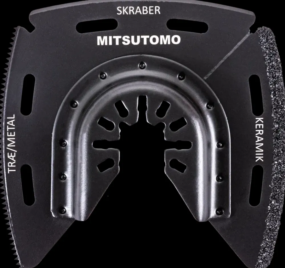 Multi-klinge til multicutter fra Mitsutomo.Klingen har tre skær til hver sit formål og er fremstillet i hårdmetal.Velegnet til træ, metal, sten, fliser og beton.Multiklingen har følgende skær:Skær 20 x 40 mm bimetal klinge til træ og metal.Skær 20 x 40 mm HCS til skrabning – f.eks. skrabe maling af træ.Skær Ø87mm med karbid til beton, sten og fliser.