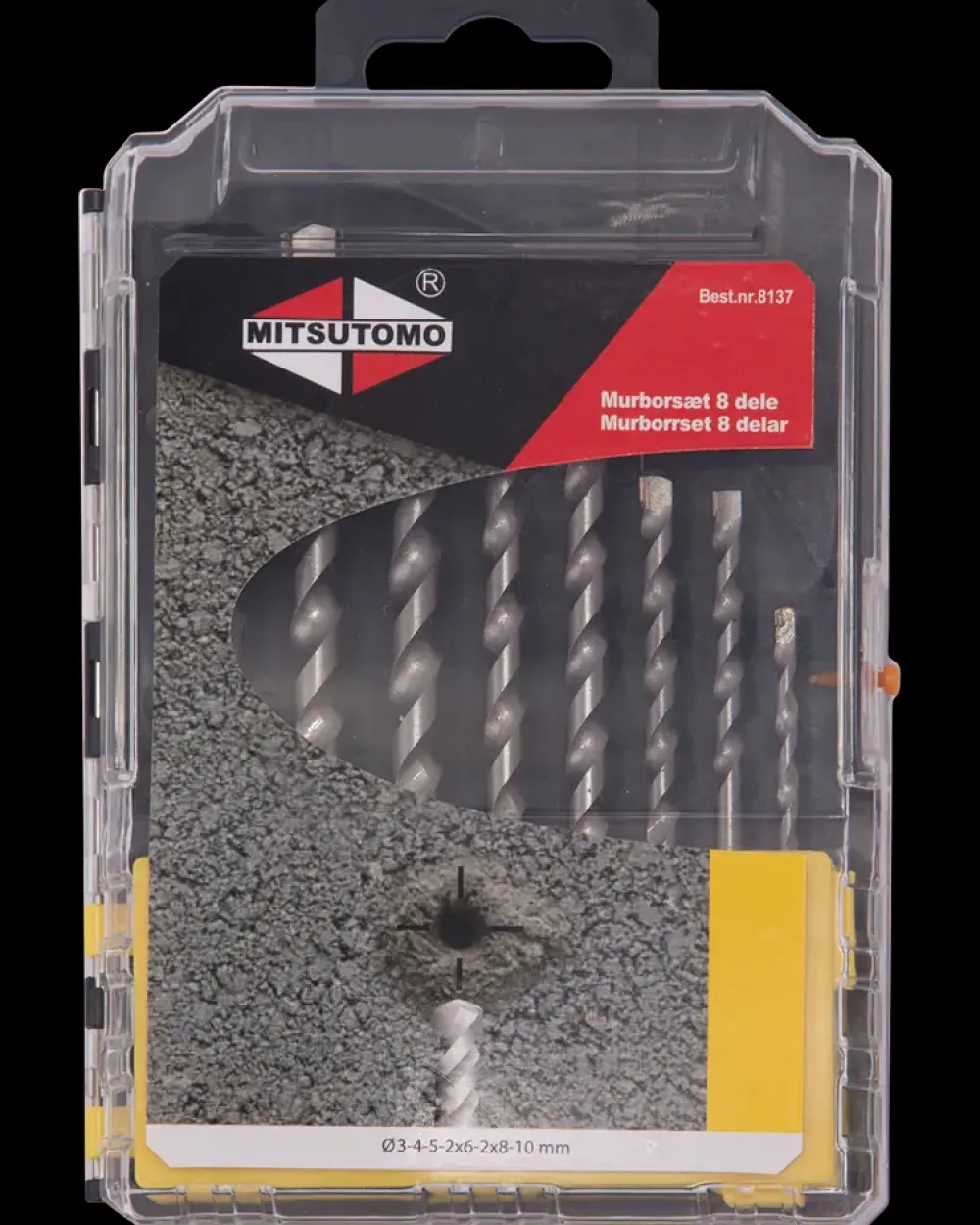 Murborsæt fra Mitsutomo.Sættet består af:1 stk. 3 mm.1 stk. 4 mm.1 stk. 5 mm.2 stk. 6 mm.2 stk. 8 mm.1 stk. 10 mm.
