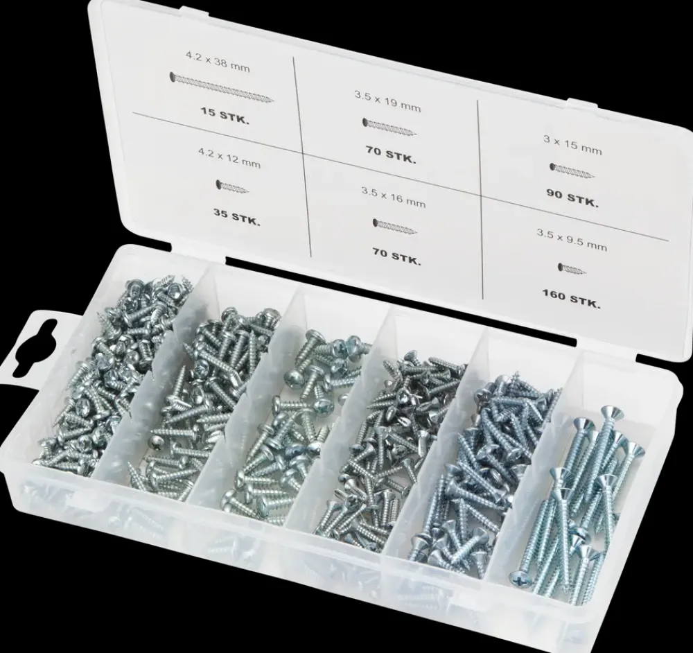 Blank-forzinket pladeskruer fra Mitsutomo, leveret i praktisk sortimentsboks.Med fladhoved og linsehoved.Sættet består af:160 stk: Ø3,5 x L. 9,5 mm.90 stk: Ø3 x L. 15 mm.70 stk: Ø3,5 x L. 16 mm.70 stk: Ø3,5 x L. 19 mm.35 stk: Ø4,2 x L. 12 mm.15 stk: Ø4,2 x L. 38 mm.