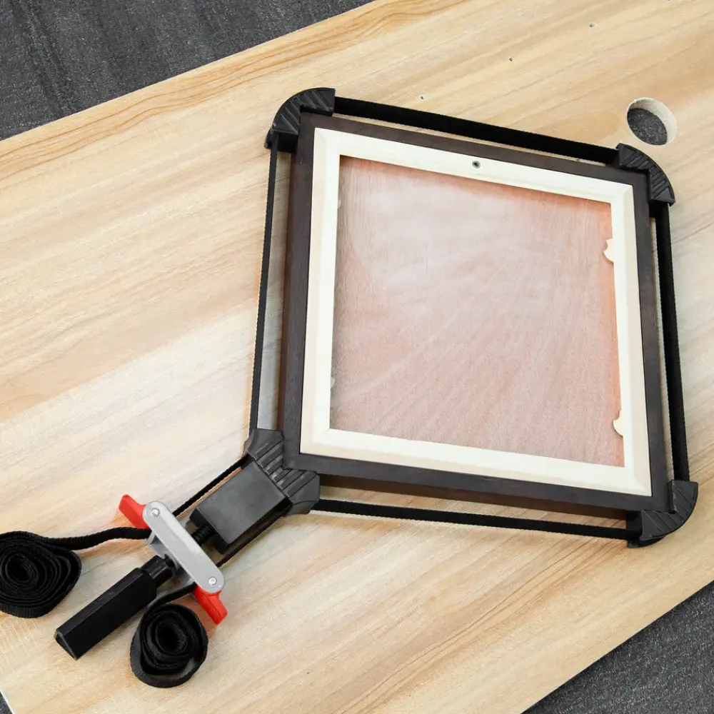 Justerbart rammespændersæt fra Mitsutomo, som giver et ensartet pres på emner som skal limes, skrues, sømmes sammen, som rammer til stoledele m.m.Brug plasthjørnerne til at spænde 45° samlinger.Perfekt til at spænde uregelmæssigt formede emner, som man normalt har svært ved at spænde da man bruger båndet uden plasthjørnerne.Remmen måler L. 328 x B. 2,4 cm.