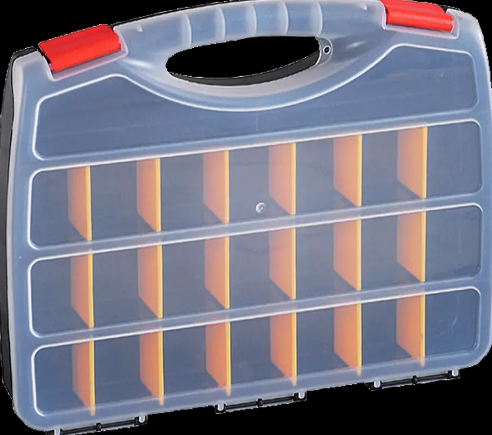Praktisk sortimentæske fra Mitsutomo med håndtag, gennemsigtigt låg og fleksibel ruminddeling.