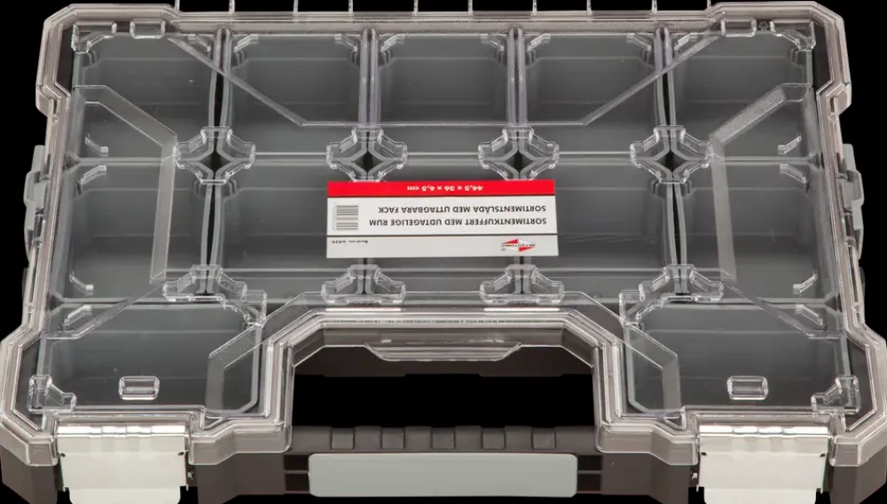 Praktisk sortimentkuffert fra Mitsutomo med håndtag, gennemsigtigt låg og udtagelige rum.