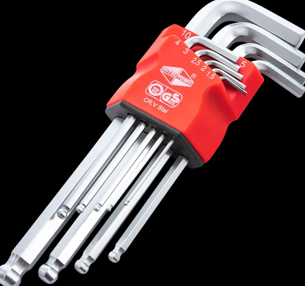 Stiftnøglesæt med kuglespids fra MITSUTOMO, der gør det muligt at arbejde i en vinkel på 25°.Sættet består af 9 stiftnøgler i str: 1½, 2, 2½, 3, 4, 5, 6, 8 og 10 mm.