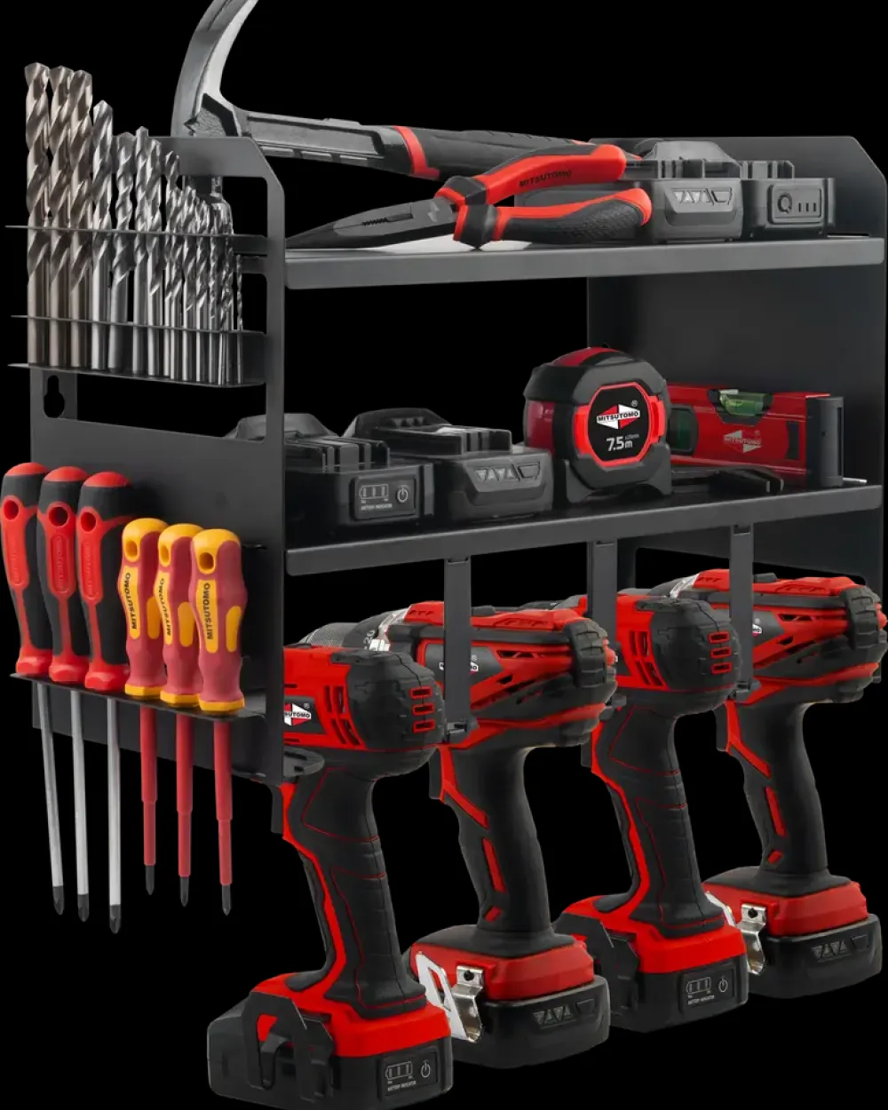 Værktøjshylde fra Mitsutomo, som giver mange muligheder for at opbevare akku-elværktøj og tilbehør.På øverste hylde er der i højre side et hul med gummi omkring til ledninger, som gør det muligt at trække en forlængerledning eller en batteri-oplader igennem.På den nederste hylde er der 4 pladser, som passer specielt til akku-elværktøj.På venstre side er der opbevaringsplads til løse bor og skruetrækker.Hver hylde har en maks. belastning på 25 kg.Skruer og plugs (inkl.).Leveres uden værktøj.