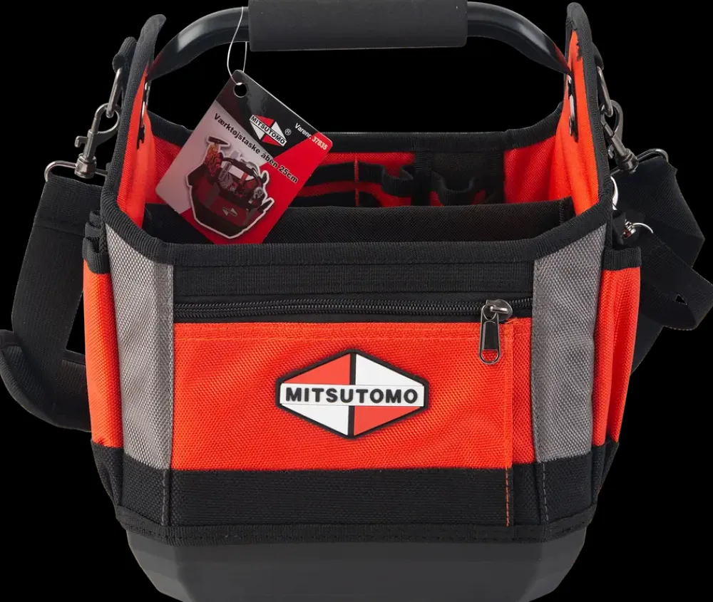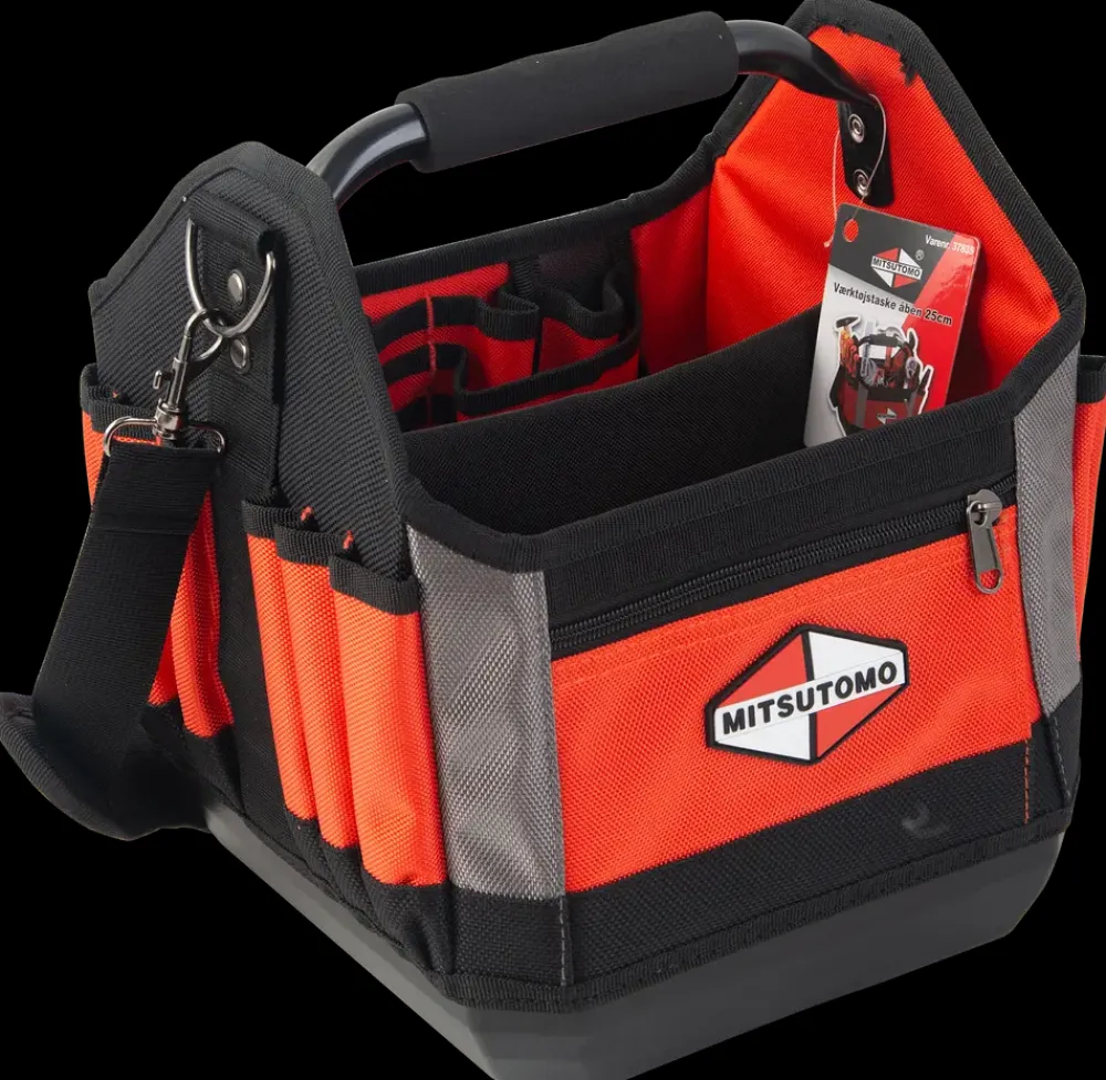 Åben værktøjstaske 25 cm fra Mitsutomo.Tasken har et stort rum og flere mindre foran og er lavet i en robust og tyk kvalitet med metalskelet.Bunden er lavet i stærk plast, så den kan stå selv og er slagfast.Håndtaget er lavet af metal med skum, så den er behagelig at bære rundt på.Værktøjstasken kommer med skulderrem så den nemt kan transporteres rundt.