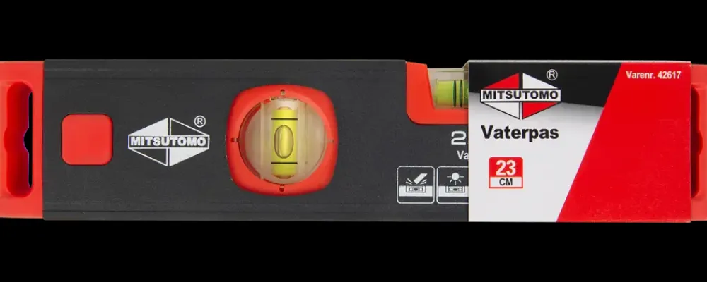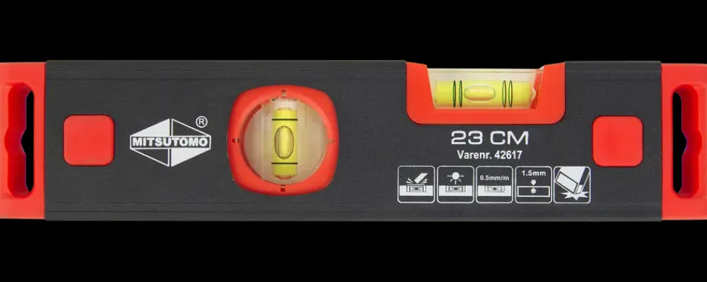 Dette vaterpas fra Mitsutomo er designet til præcisionsarbejde. Med en længde på 23 cm er det ideelt til opgaver, hvor der kræves kompakt og nøjagtig nivellering.Vaterpasset er udstyret med tre libeller, der muliggør måling i både vandret (180°), lodret (90°) samt i 45° vinkel. Det giver alsidighed ved montage, snedkerarbejde og installationsopgaver. Den planfræsede anlægsflade sikrer høj præcision med en nøjagtighed på ±0,5 mm/m.Produktet er fremstillet i let, men robust aluminium og har en godstykkelse på 1,5 mm. Enderne er udstyret med stødabsorberende gummi, hvilket beskytter vaterpasset mod slag og bidrager til længere holdbarhed.Det sorte og røde design kombineret med de klare libeller gør det nemt at aflæse målinger hurtigt og præcist.