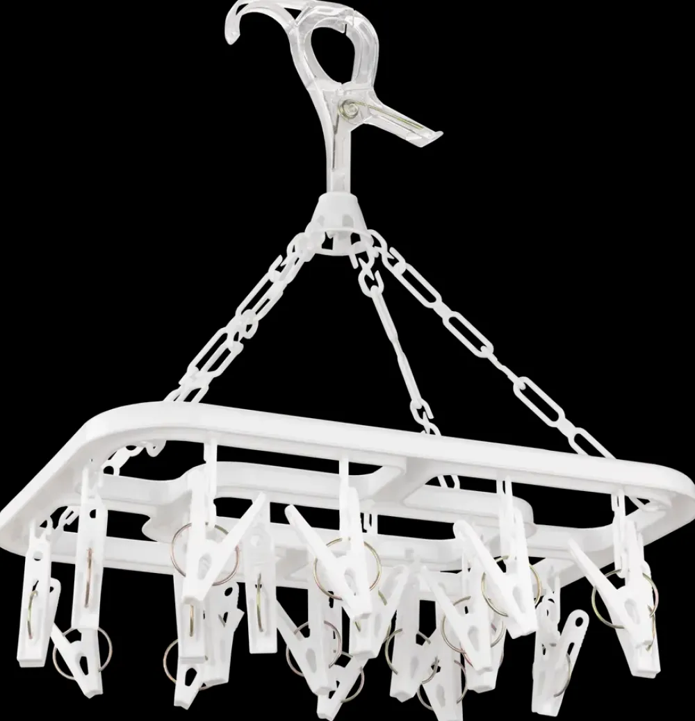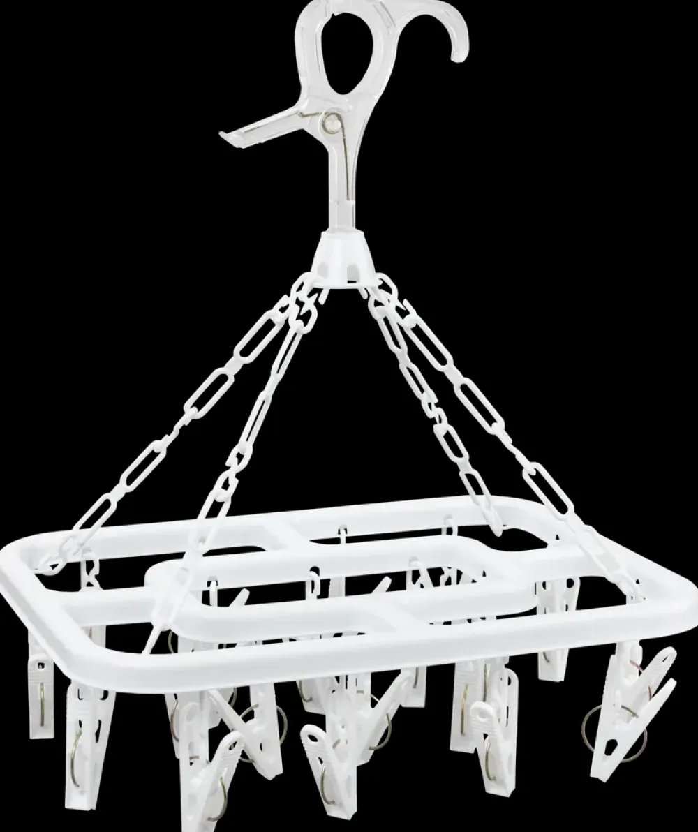 Dette pladsbesparende tørrestativ er ideelt til tørring af sokker, undertøj og små beklædningsdele. Det er fremstillet af holdbar PP-plast, som gør det både let og robust – vejer kun 170 g. Stativet måler L. 29,5 x B. 21 x H. 36 cm og kan nemt hænges op på steder med begrænset plads, f.eks. i lejligheder, på campingture eller under rejser.De 20 klemmer holder tøjet sikkert fast, mens den drejelige krog gør det nemt at hænge stativet på snore, stænger eller gelændere. Mål: L. 29,5 x B. 21 x H. 36 cmMateriale: PP-plastFarve: HvidVægt: 170 g