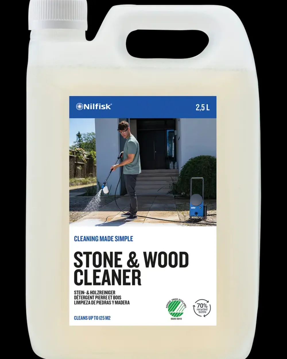 Nilfisk træ- og fliserens er et Svanemærket rengøringsmiddel med et indhold på 2,5 liter, udviklet til skånsom og effektiv vedligeholdelse af fliser, murværk, træværk, tage og udhuse. Den milde skumformel fjerner hurtigt almindeligt snavs uden at skade omgivelserne, såsom planter og græs.