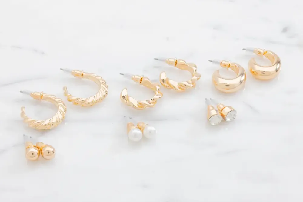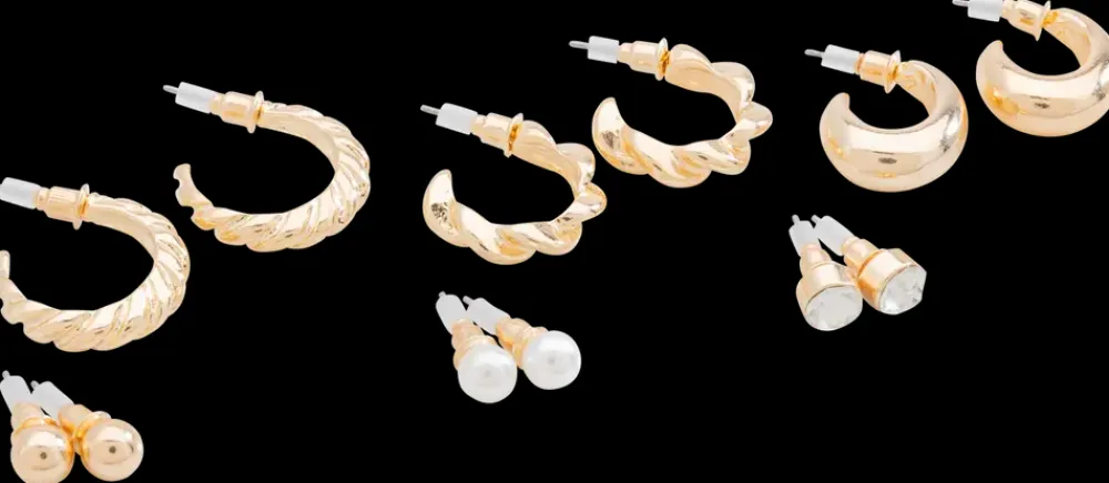 Sæt med 6 par elegante øreringe i zink med gylden finish. Sættet inkluderer tre par hoop-øreringe i forskellige designs samt tre par klassiske ørestikker – to med perleeffekt og ét med glitrende sten. En alsidig samling, der passer til både hverdag og fest. Øreringene er nikkelfri og skånsomme mod huden, hvilket gør dem behagelige at bære hele dagen.De er ikke vandresistente og bør opbevares tørt for at bevare deres glans og holdbarhed.