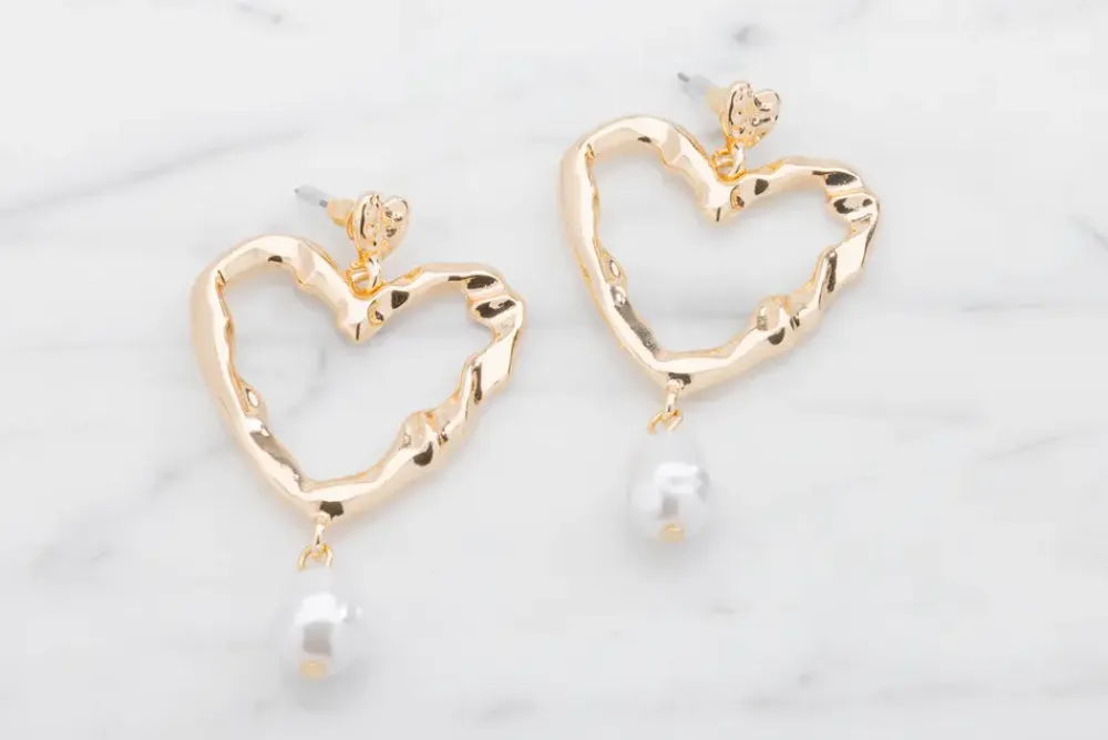 Elegante øreringe i zink med hjerteform og plastik perler. Den gyldne farve og det klassiske design gør dem velegnede til både hverdag og fest. Øreringene er nikkelfri og derfor skånsomme mod huden. De er ikke vandresistente og bør opbevares tørt for at bevare glansen.