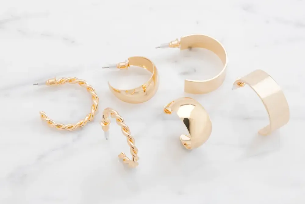 Sæt med 3 par hoop-øreringe i forskellige designs med en smuk gylden finish. Sættet inkluderer et glat klassisk par, et snoet par og et bredere par. Perfekte til både hverdagsbrug og festlige anledninger. Øreringene er nikkelfri og skånsomme mod huden, hvilket gør dem behagelige at bære hele dagen.De er ikke vandresistente og bør opbevares tørt for at bevare deres glans og holdbarhed.