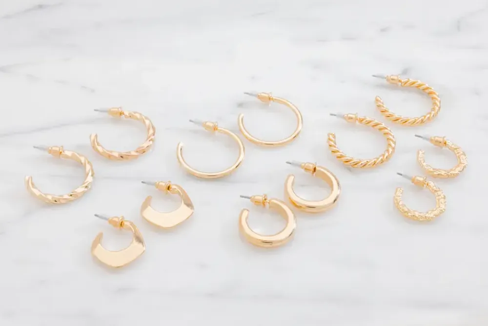 Sæt med 6 par elegante hoop-øreringe i zink og jern med en gylden finish. Sættet inkluderer forskellige designs, herunder klassiske glatte hoops, snoede og hamrede modeller.Perfekt til både hverdag og festlige anledninger. Øreringene er nikkelfri og skånsomme mod huden, hvilket gør dem behagelige at bære hele dagen.De er ikke vandresistente og bør opbevares tørt for at bevare deres glans og holdbarhed.