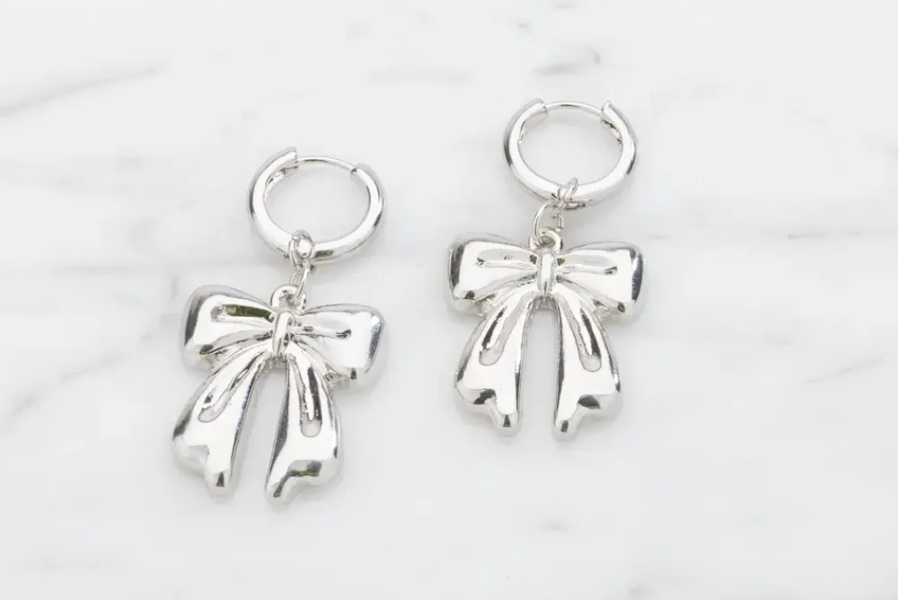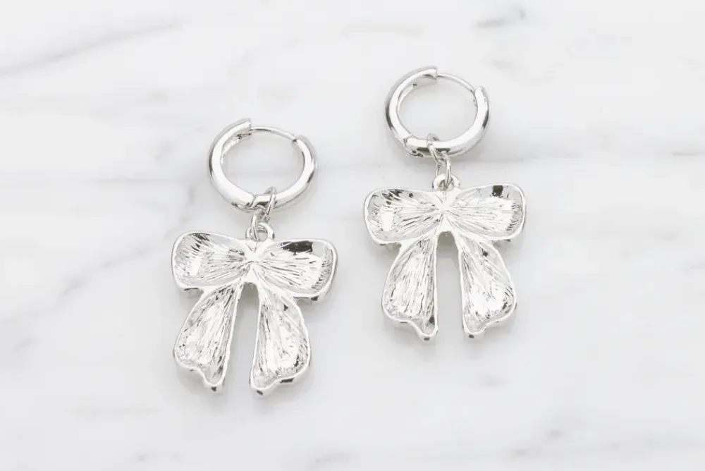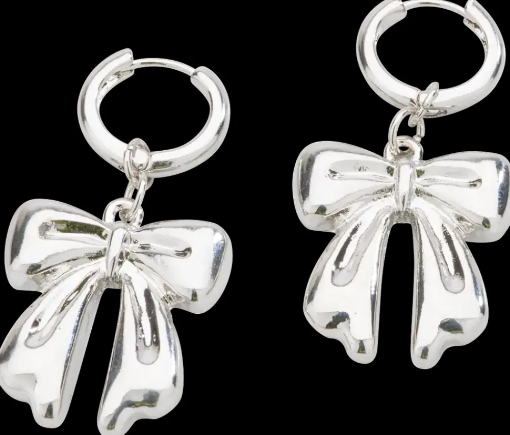 Stilfulde hoop-øreringe i zink med en elegant sløjfedetalje. Den sølvfarvede finish giver et tidløst og feminint udtryk, der passer perfekt til både hverdag og fest. Øreringene er nikkelfri og skånsomme mod huden, hvilket gør dem behagelige at bære hele dagen.De er ikke vandresistente og bør opbevares tørt for at bevare deres glans og holdbarhed.