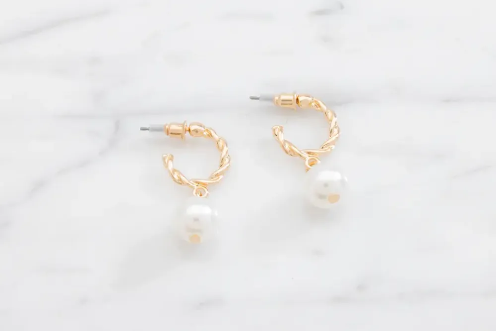 Elegante hoop-øreringe i snoet design med perle detalje. Den gyldne finish giver et stilfuldt og tidløst look, perfekt til både hverdag og festlige anledninger. Øreringene er nikkelfri og skånsomme mod huden, hvilket gør dem behagelige at bære hele dagen. De er ikke vandresistente og bør opbevares tørt for at bevare deres glans og holdbarhed.