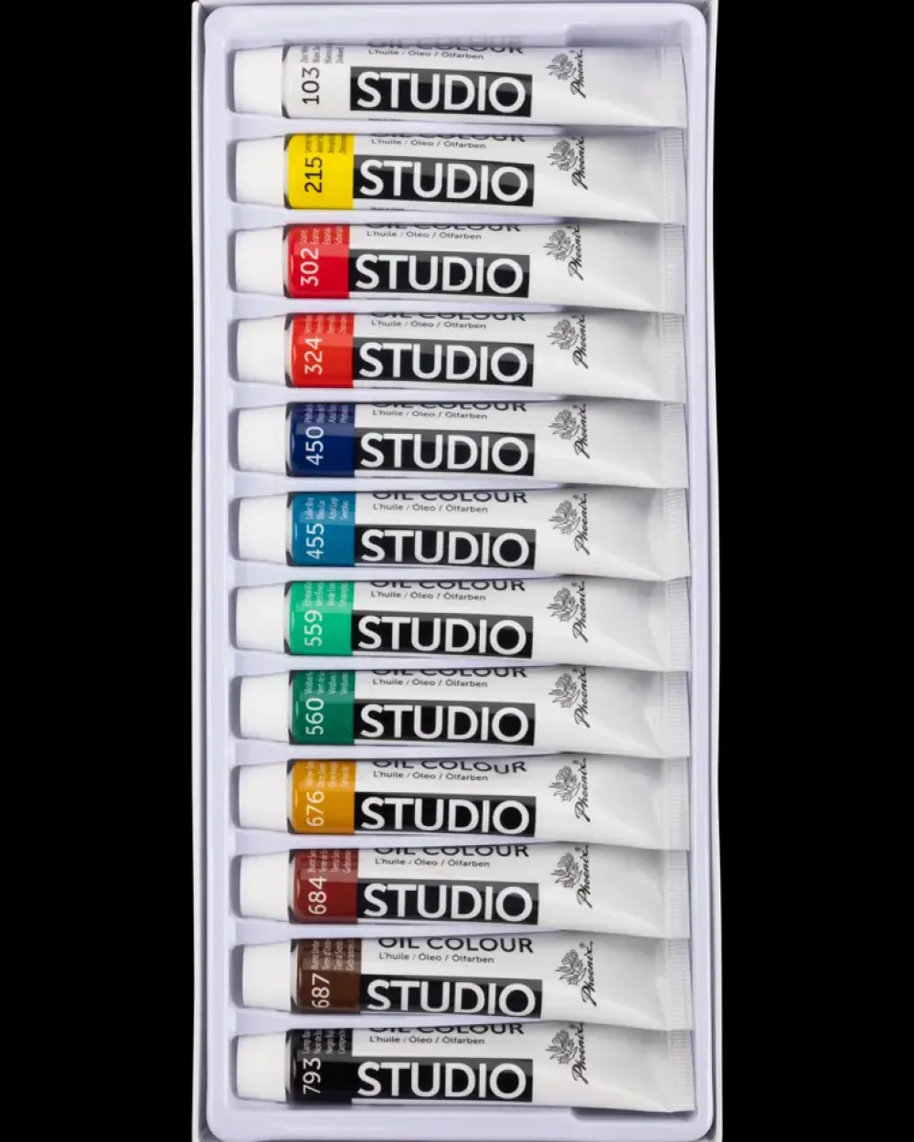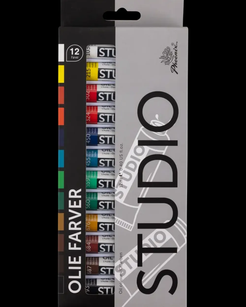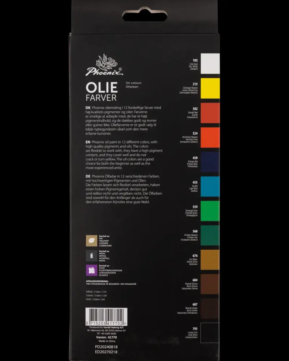 Phoenix oliefarvesæt med 12 forskellige farver af høj kvalitet. Hver tube indeholder 12 ml maling med højt pigmentindhold, der sikrer god dækkeevne uden at revne eller gulne over tid. Farverne er velegnede til både nybegyndere og erfarne kunstnere. Sættet indeholder farverne Zink Hvid, Citrongul Nuance, Scarlet Rød, Vermillion Nuance, Phthalo Blå, Sø Blå, Smaragd Grøn, Viridian Nuance, Gul Okker, Brændt Sienna, Brændt Umber og Lampe Sort.