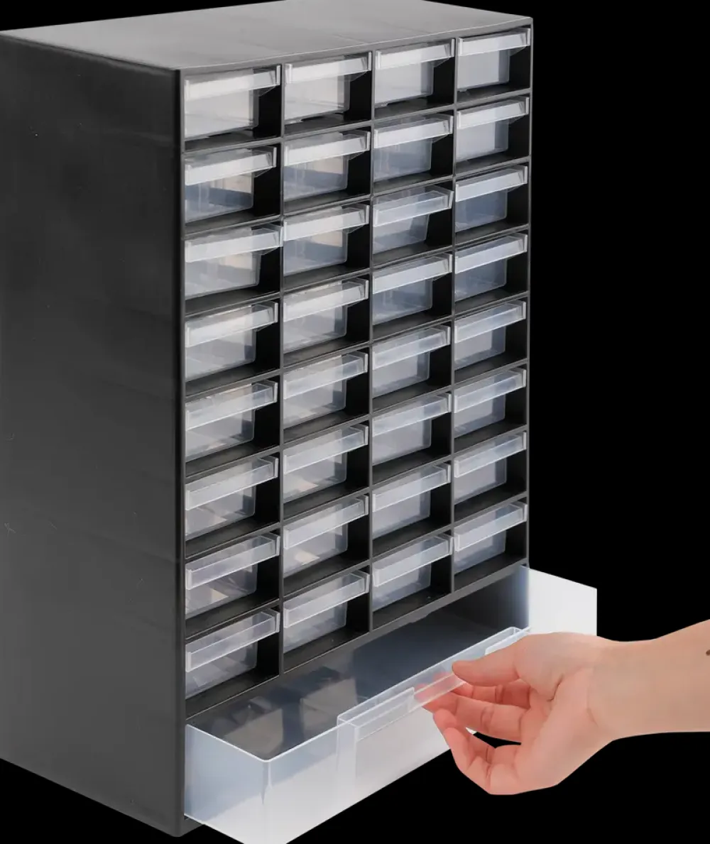 Opbevaringskasse med 33 rum og 32 rumdelere. Velegnet til systematisk opbevaring af småting i hjemmet, værkstedet eller hobbyrummet. Egnet til skruer, nåle, elektroniske komponenter, medicin og andre små dele. Klare skuffer giver hurtigt overblik over indholdet.Fremstillet i slidstærkt PP-plast med sort ramme og transparente skuffer.Kompakt og overskuelig opbygning – praktisk til både privat og semi-professionel brug.