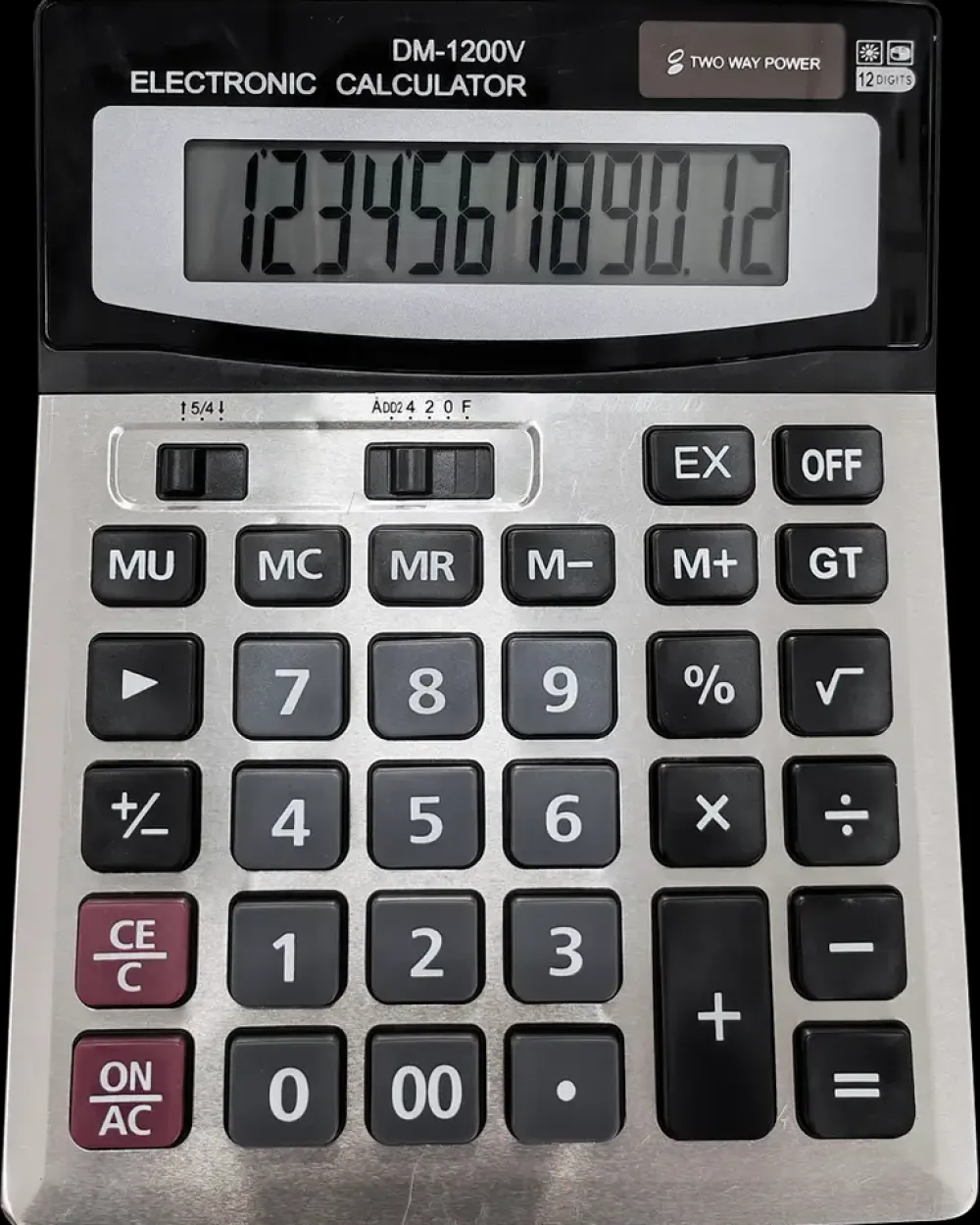 Stor lommeregner med solcelle og batterifunktion. Display med 12 cifre.Med mange funktionerMål: 19 x 14,5 cmBatterier skal købes separat.