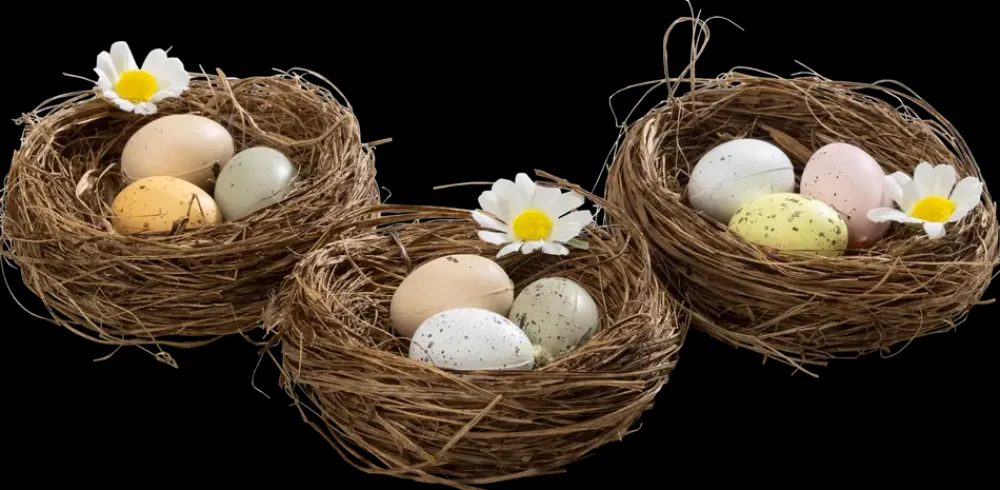 Pynt op til påske med disse 3 små reder med påskeæg. Med en højde på 7 cm er de nemme at placere i dekorationer og arrangementer rundt omkring i hjemmet.Bemærk, det er ikke legetøj og ikke egnet til børn under 3 år.