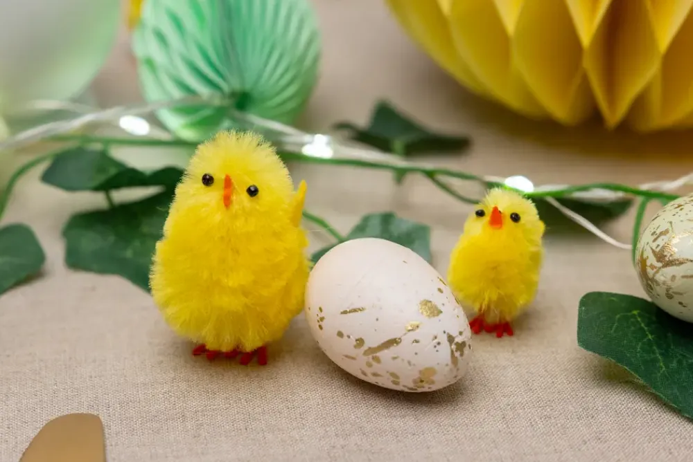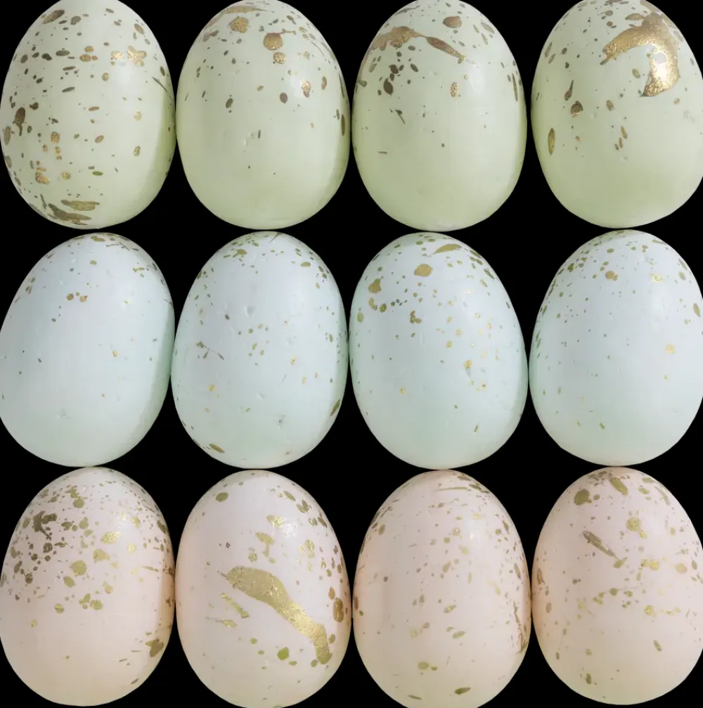 En pose med 12 dekorative påskeæg i elegante pastelfarver med gyldne detaljer. Disse æg er velegnet som pynt til påskebordet, i en reol eller som dekorative elementer i potteplanter. Farverne inkluderer blå, grøn og lyserød.Mål: Højde 5 cm Ø 3,5 cm.