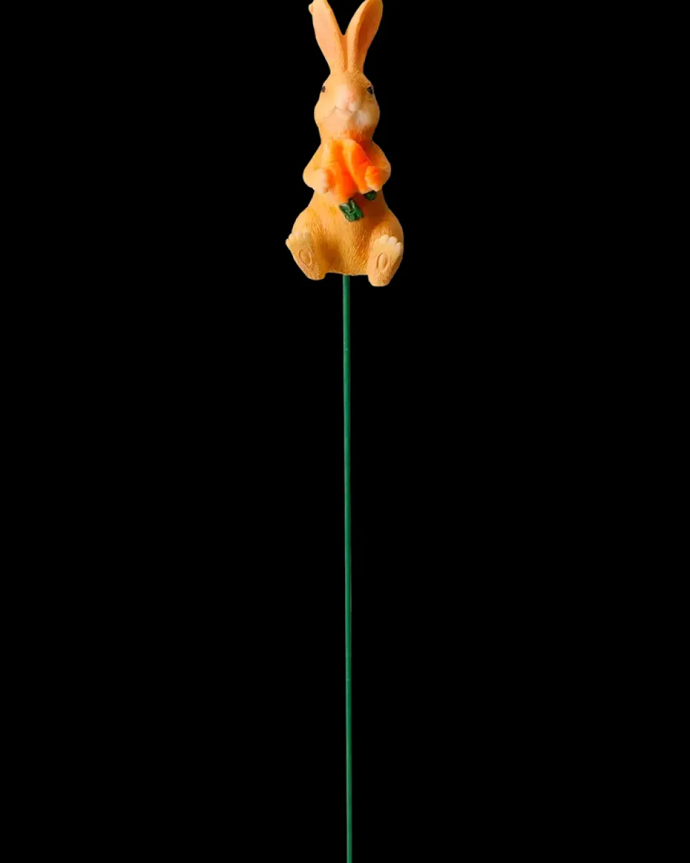 Dekorativ kanin på pind, perfekt til påskedekorationer og blomsterarrangementer. Kaninen måler 5 x 4 cm og er monteret på en 28 cm lang pind, hvilket gør den nem at placere i potteplanter, krukker eller andre dekorationer. De søde kaniner fås i fire forskellige designs med påsketema, herunder motiver med gulerødder, påskeæg og blomster.Bemærk: Designet kan ikke vælges ved køb i webshoppen.