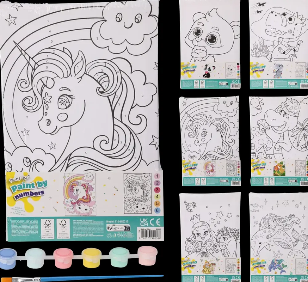 Malesæt, paint by numbers. 195 x 295 mm lærred. Indeholder en pensel, 16,5 cm og 6 små bøtter med 3 ml akryl maling. Findes i 6 forskellige børnemotiver, enhjørning, panda, havfrue, dinosaurus, robot og prinsesse.Det er ikke muligt at vælge motiv i webshoppen.
