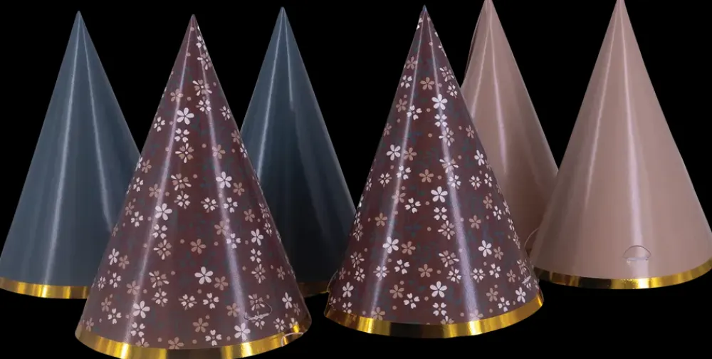 Papirhatte i tre forskellige designs og farver.Pakken indeholder 6 hatte – 2 af hver design der tilføjer et festligt udtryk til fødselsdage, nytårsaften eller andre særlige lejligheder.Farver: Blågrå, brun med blomsterprint og rosa.