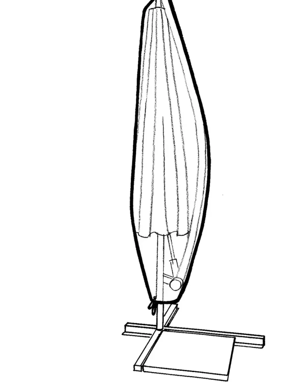 Praktisk buet parasolovertræk i kraftigt PVC-coated nylon.