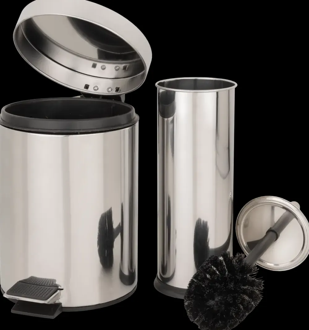 Toiletsæt i rustfrit stål med blank spejlfinish. Består af pedalspand og toiletbørste i enkelt, cylinderformet design, der passer godt til moderne badeværelser.Pedalspanden har rillet fodpedal og indvendig plastspand, som nemt kan tages ud og rengøres. Toiletbørsten er skjult i en lukket beholder med matchende design.Begge dele har sorte gummikanter i bunden, som beskytter gulvet og giver stabilitet. Det rustfrie stål sikrer høj slidstyrke og modstand mod fugt.Pedalspanden har en kapacitet på 3 liter og en højde på 24,3 cm