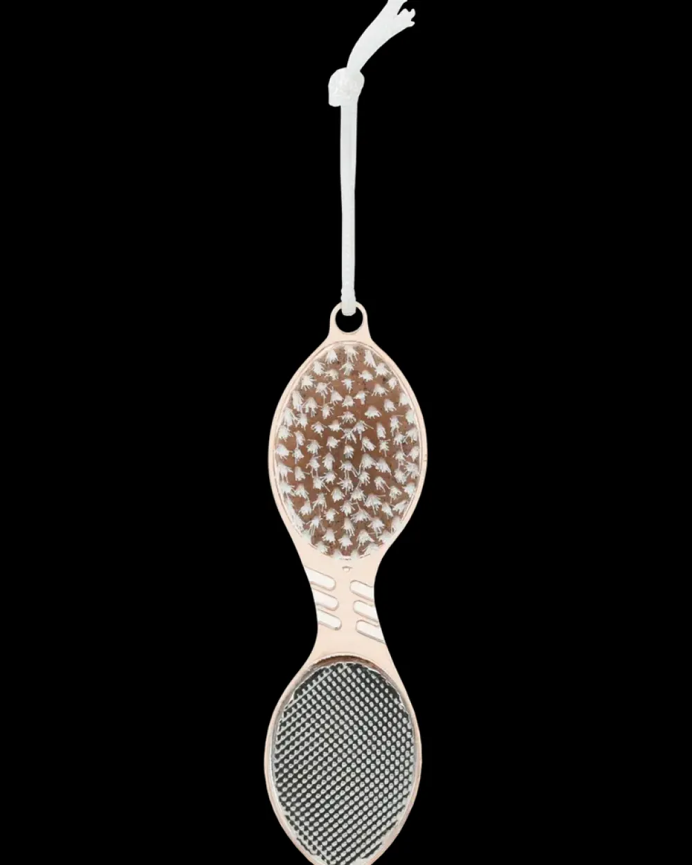 Kombineret fodfil med fire funktioner samlet i ét redskab: børste til rengøring af fødder, pimpsten til fjernelse af hård hud, samt fil og skrubber til udglatning af ru områder. Redskabet har et plastgreb, der sikrer et godt og stabilt hold under brug. Udstyret med snor til ophæng og tørring efter brug.Velegnet til daglig fodpleje og pedicure i hjemmet.Farve kan ikke vælges ved køb i webshoppen.