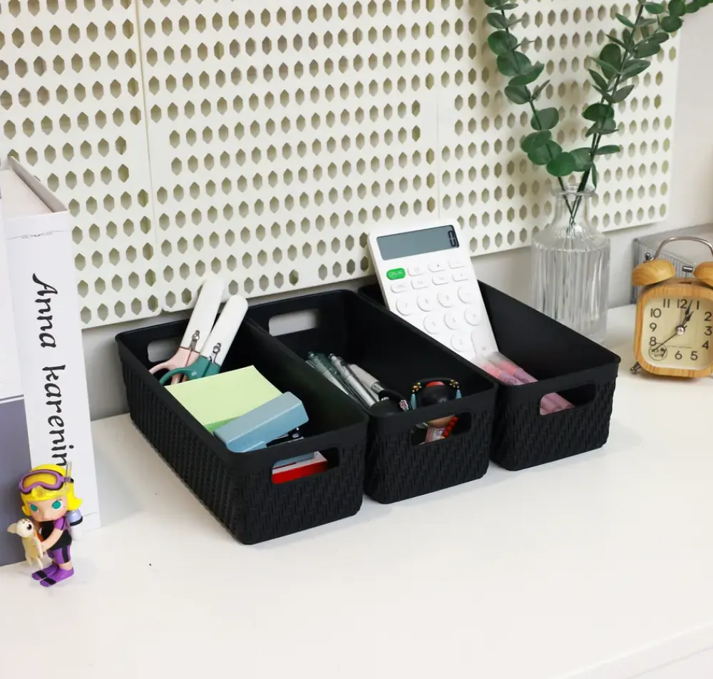 Denne flettede plastikkurv byder på mange opbevaringsmuligheder, lige fra kontorartikler til legetøj på børneværelset.Kurven er lavet i et fletdesign, der giver et moderne og hjemligt look, så det passer ind i de fleste boligindretninger og kommer i en klassisk sort farve.Opbevaringskurvens materiale gør, at den er nem at gøre ren.