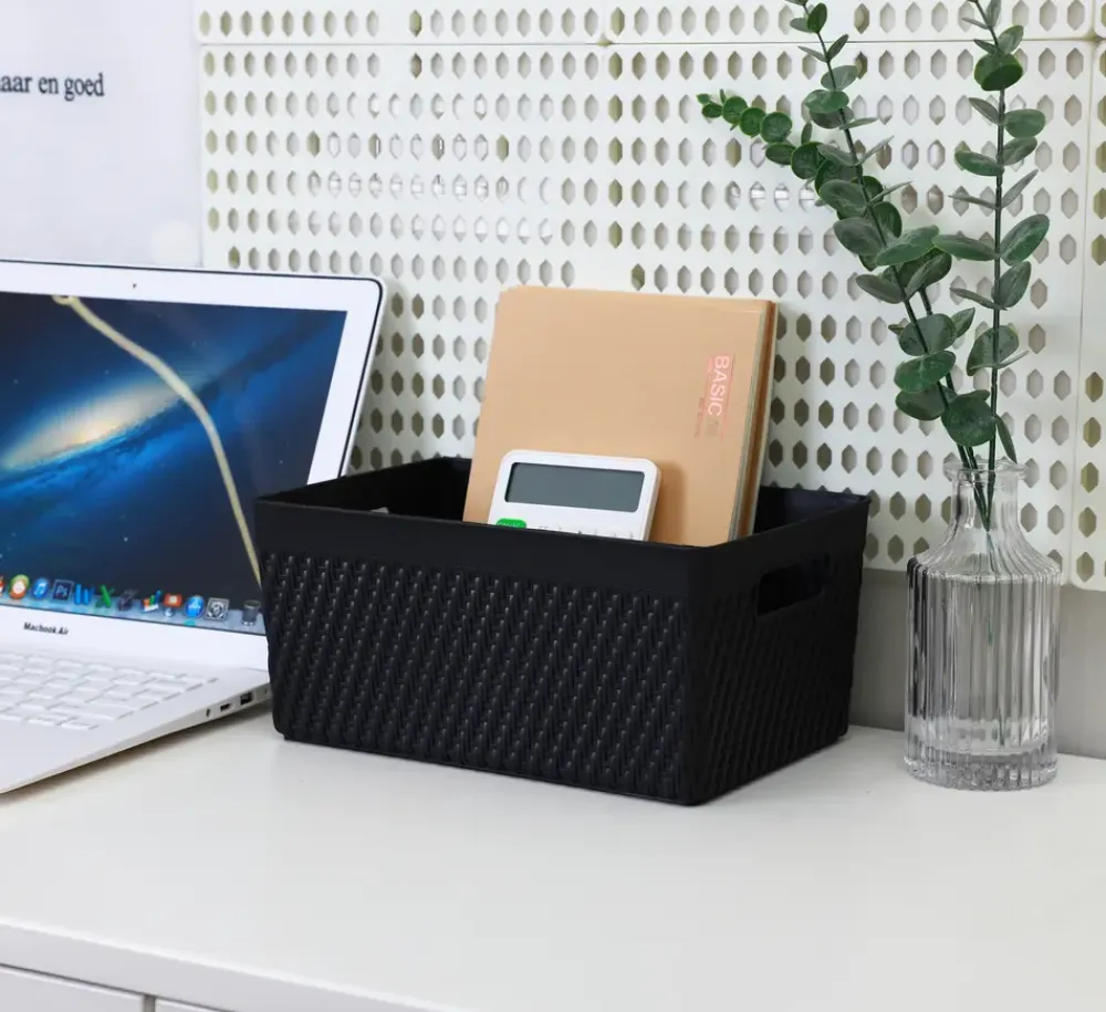 Denne flettede plastikkurv byder på mange opbevaringsmuligheder, lige fra kontorartikler til legetøj på børneværelset.Kurven er lavet i et fletdesign, der giver et moderne og hjemligt look, så det passer ind i de fleste boligindretninger og kommer i en klassisk sort.Opbevaringskurvens materiale gør, at den er nem at gøre ren.