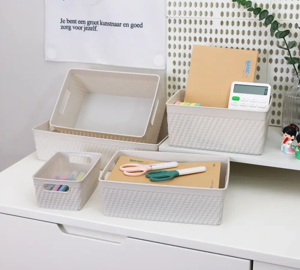 Denne flettede plastikkurv byder på mange opbevaringsmuligheder, lige fra kontorartikler til legetøj på børneværelset.Kurven er lavet i et fletdesign, der giver et moderne og hjemligt look så den passer ind i de fleste boligindretninger og kommer i en lys og frisk farve.Opbevaringskurvens materiale gør, at den er nem at gøre ren.