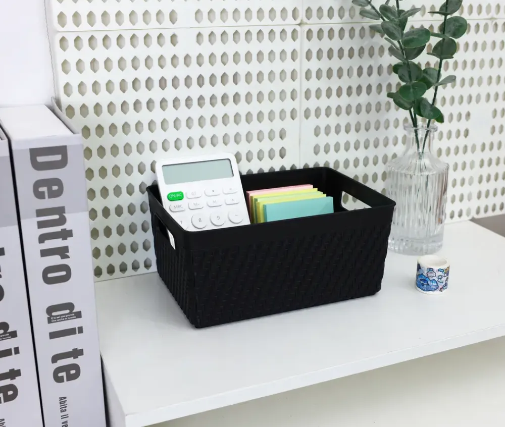 Denne flettede plastikkurv byder på mange opbevaringsmuligheder, lige fra kontorartikler til legetøj på børneværelset.Kurven er lavet i et fletdesign, der giver et moderne og hjemligt look så den passer ind i de fleste boligindretninger og kommer i en klassisk sort.Opbevaringskurvens materiale gør, at den er nem at gøre ren.
