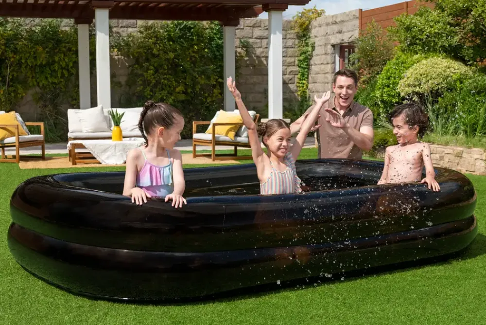 Oppustelig pool til udendørs brug i have eller på græsplæne. Poolen har rektangulær form og giver plads til leg og afkøling på varme dage. Konstruktionen består af to ens luftringe, som giver stabil form, når bassinet fyldes med vand.Poolen pustes op og fyldes med vand til brug i haven. Den kan også anvendes uden vand, hvor den kan fyldes med bolde eller legetøj til leg. Formen giver plads til flere børn samtidig, og den oppustelige kant fungerer som blød støtte langs kanten.Bassinet kan tømmes, tørlægges og foldes sammen efter brug, hvilket gør opbevaring enklere uden for sæsonen. En reparationslap medfølger til mindre reparationer ved punktering.Tekniske detaljer og målKapacitet: 778 literH. 51 x B. 175 x L. 262 cmMateriale: PVCFarve: SortKonstruktion: 2 luftringe i samme størrelseMedfølger: 1 stk. reparationslap