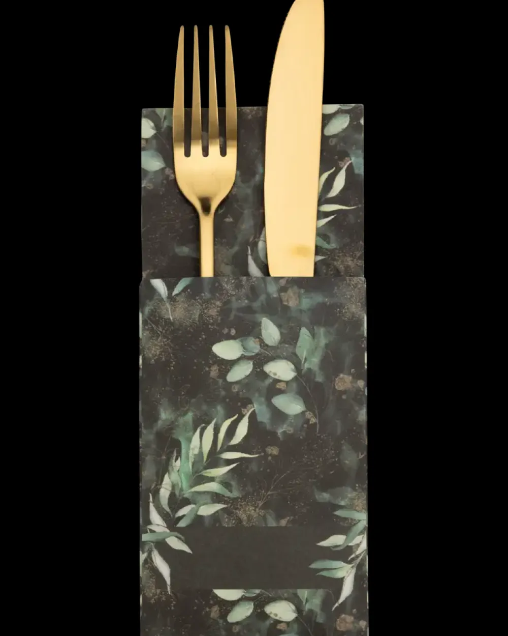 Pakke med 10 bestikposer til nem og dekorativ borddækning.Holder knive, gafler og skeer samlet på en praktisk og stilren måde.Hver pose måler 20 x 8,5 cm.Velegnet til fester, middage og andre arrangementer.
