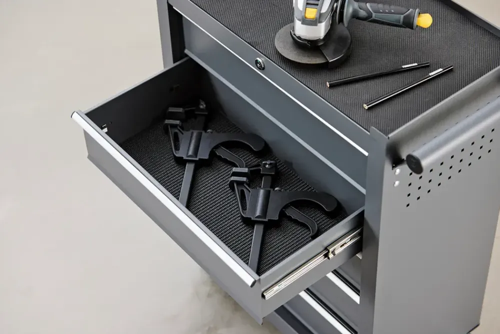 Værktøjsvogn med 5 skuffer til opbevaring og organisering af håndværktøj i værksted, garage eller hobbyrum. Konstruktionen i stål kombineret med skuffer på kuglelejer giver stabil opbevaring og let udtræk i daglig brug. Vognen er udstyret med låsesystem, så alle skuffer kan aflåses samlet.Hver skuffe måler 530 x 291 x 105 mm og har en maksimal belastning på 15 kg. Den samlede kapacitet for vognen er 110 kg, og toppladen kan belastes med op til 35 kg. EVA-måtter i skuffer og på top beskytter både værktøj og overflade mod ridser og slag.Fire 4″ hjul – heraf to drejelige med bremse og to faste – sikrer stabil kørsel og mulighed for at låse vognen under arbejde. Sidepanel med firkantede huller giver mulighed for montering af medfølgende kroge.Mål: H. 85 x B. 33 x L. 61,6 cmSkuffemål: 530 x 291 x 105 mmMaks. belastning pr. skuffe: 15 kgMaks. total belastning: 110 kgTopplade kapacitet: 35 kgMateriale: StålFarve: Sort og gråModel: 106830